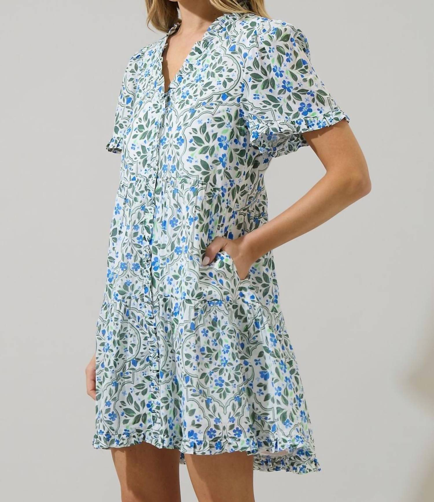 A short and breezy dress for those warmer days. The Hilo Floral Kara Shift Mini Dress is an ideal piece for any occasion. Featuring a flattering V-neckline with ruffles along the sleeves, neck and front. The relaxed fit of the shift design ensures all-day comfort. Pair it with green or blue heels. - V-neck - Shift - Pockets - Floral - Color: Wht Blue Green