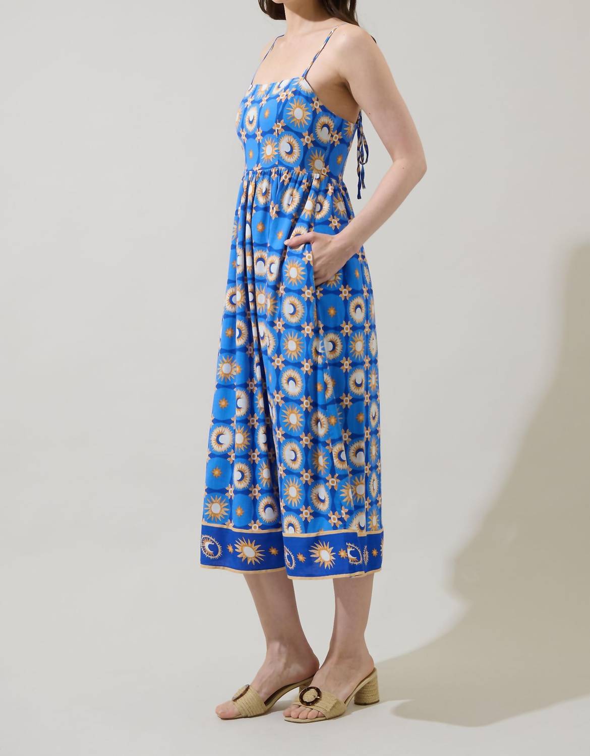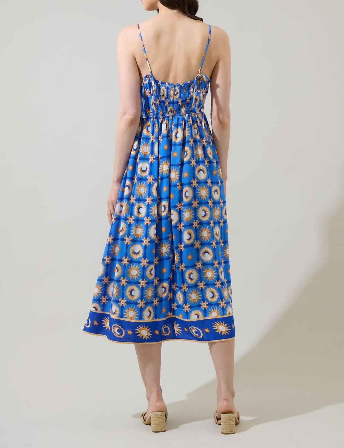 The perfect length dress does exist. Discover effortless charm with the Moonshine Senia Midi Dress by SUGARLIPS, a staple for your summer wardrobe. This captivating piece features slender spaghetti straps with a fit and flare silhouette, enhanced by its multi-patterned design. Made for easy wear, it includes a sleek pull-on closure, while the flowing skirt and comfortable smocked back ensure graceful movement and a snug fit. Ideal for beach days, this dress offers a 42" length and a chest measurement of 16 1/2" in size S. Model is 5'9" wearing a size XS.