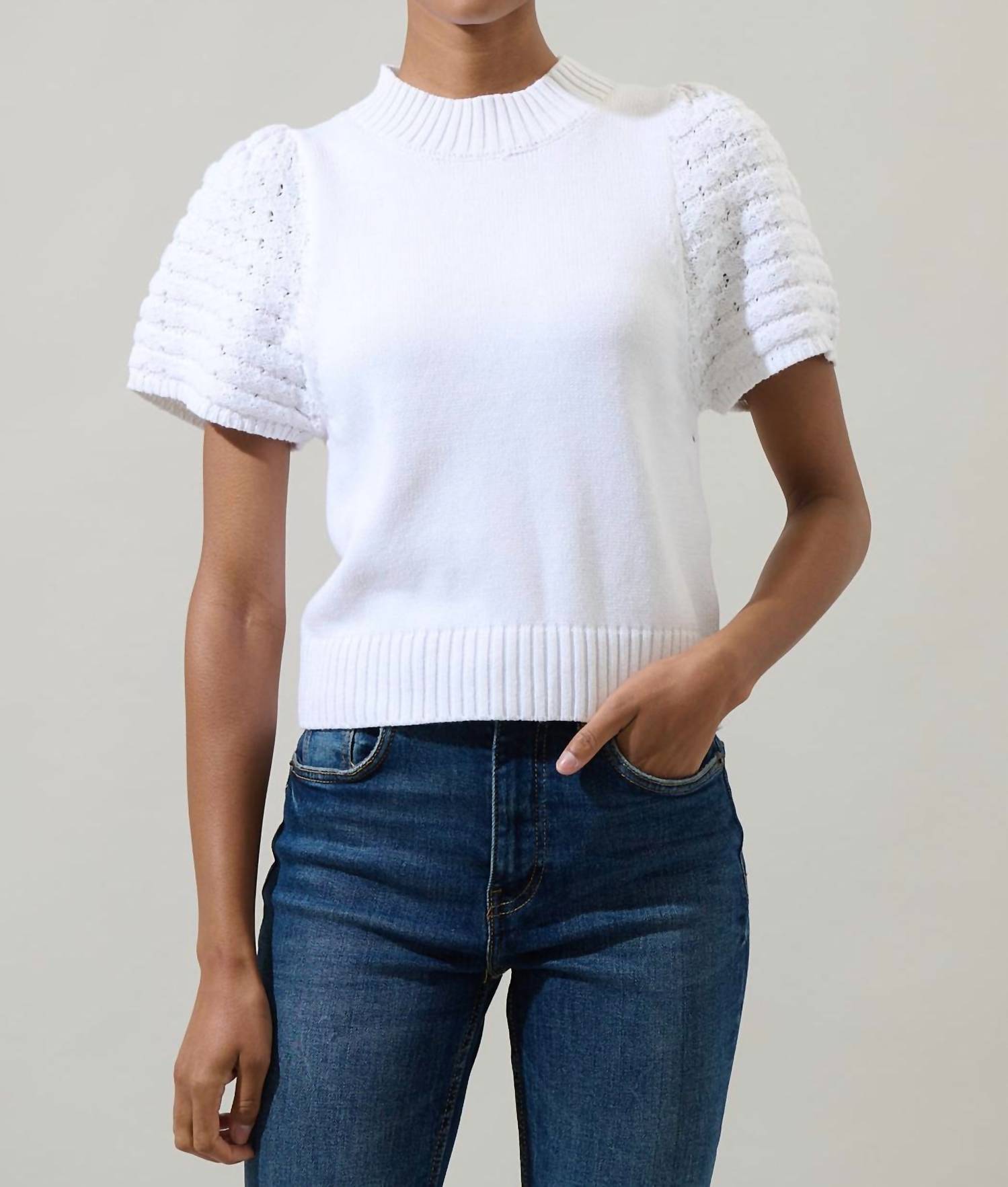 Layer under your favorite sweater or wear tucked into jeans for a perfectly polished winter look. Meet the Pearla Crochet Sleeve Sweater by SUGARLIPS, a must-have for your minimalist wardrobe in a crisp white. This sweater top is crafted with short crochet sleeves and features a thick ribbed neckline, maintaining a standard fit with a slightly cropped hemline. Composition: 60% Cotton, 40% Acrylic. Closure: Pull on. Care: Machine wash.