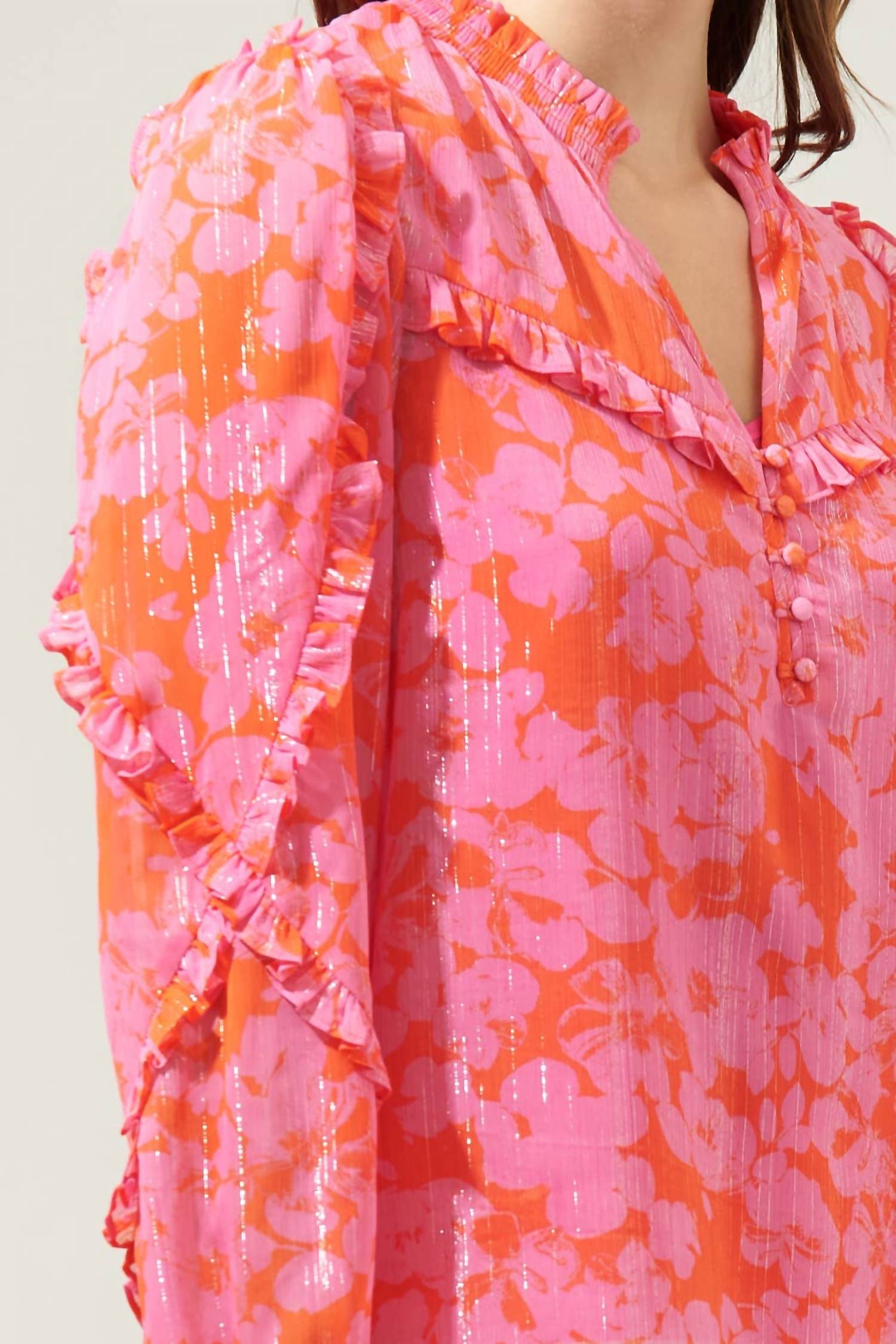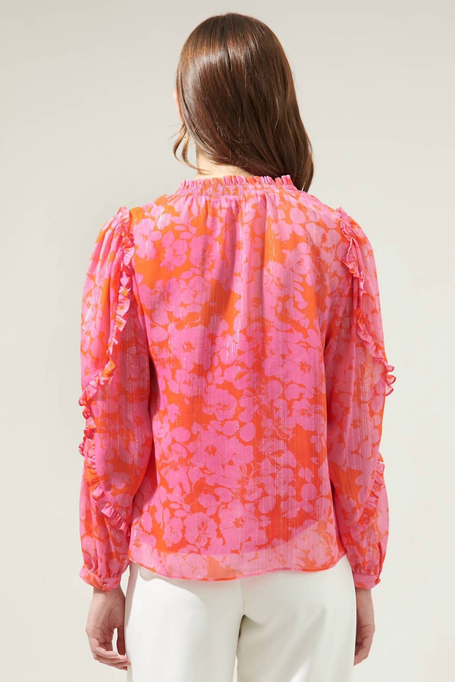 Pair this with your favorite jeans and slides for your next girls night out. Introducing the Ventura Floral Blouse by SUGARLIPS, a delightful piece in charming red pink, perfect for any holiday party. This beautifully patterned long sleeve blouse features an elegant V-neckline with a button closure, adorned with allover floral prints and ruffle details, enhancing its boho chic trend. Designed with a relaxed fit, its garment length is 25 inches, offering versatile styling with high-waisted jeans or shorts. Made to capture the essence of Valentine's Day, it’s a lovely choice for fall occasions.
