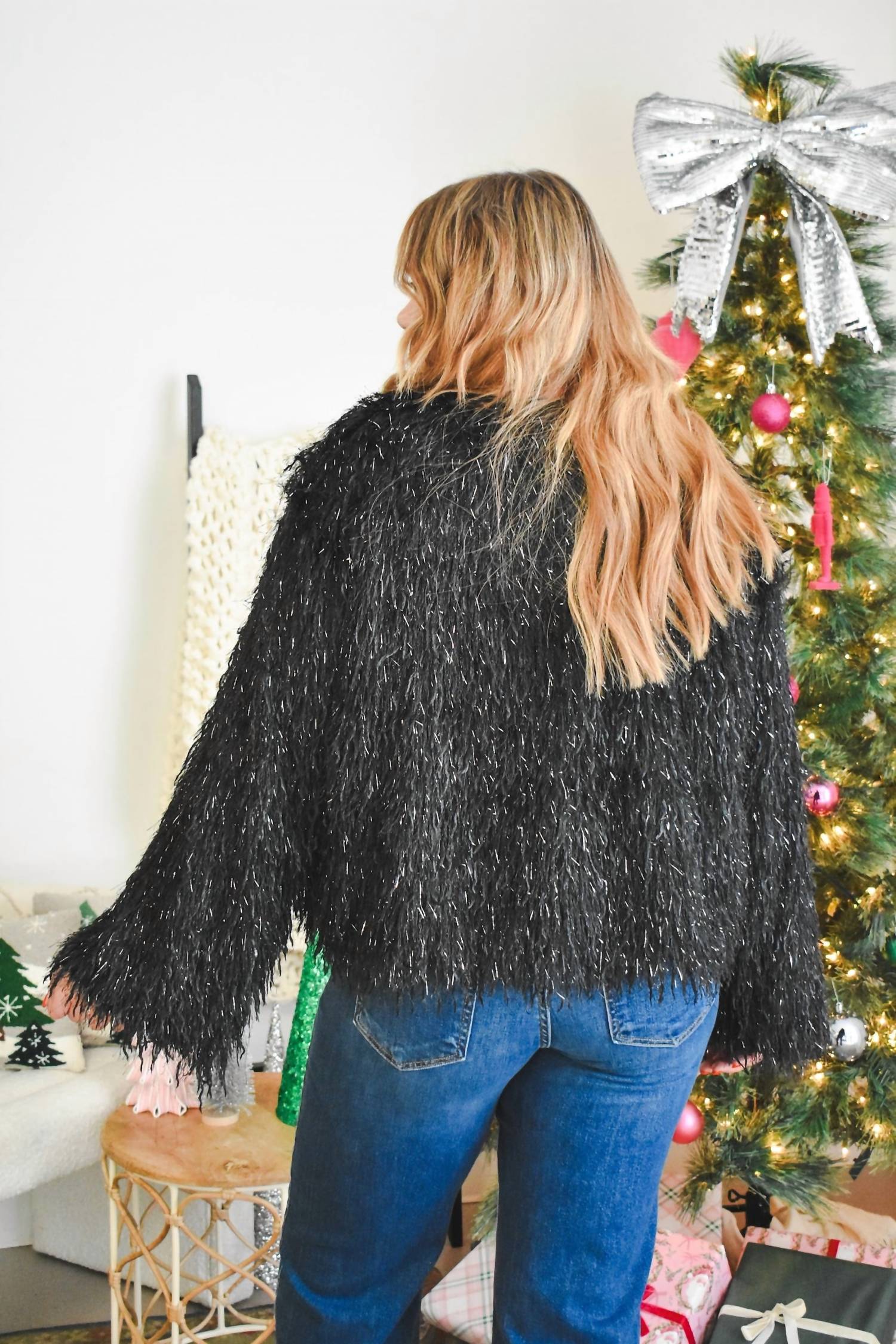 Nothing is cooler than this vintage inspired bomber jacket. Introducing the Women's Himari Metallic Fringe Jacket by SUGARLIPS, crafted to make a bold statement with its eye-catching design. This striking bomber jacket features long sleeves and is made from durable faux leather, accentuated by textured metallic fringe for added movement and style. The lined garment measures 20 3/4" in length and offers a chic black hue, perfect for a winter holiday party ensemble. Designed with a pull-on closure, this piece is an ideal choice for those who embrace the maximalist trend. Model is 5'9" and wears size XS (measurements based on size S: Chest 10 1/2", Length 20 3/4").