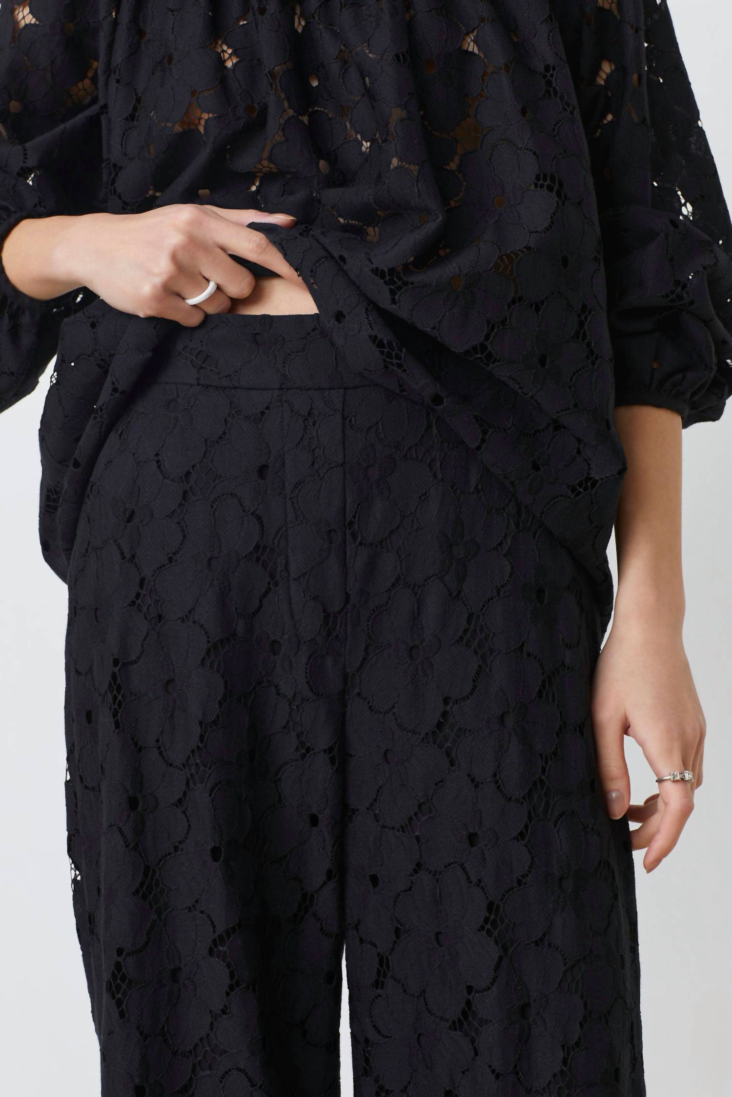 Discover the Eyelet Wide Leg Pants by Suncoo, a stylish addition to your spring wardrobe in classic black. Designed for a relaxed fit, these high-rise pants feature intricate floral patterns that add texture and sophistication. Crafted from 52% Polyamide and 48% Cotton, they offer comfort and style. Care: Machine wash. Perfect for a monochrome look during vacation or Thanksgiving gatherings.
