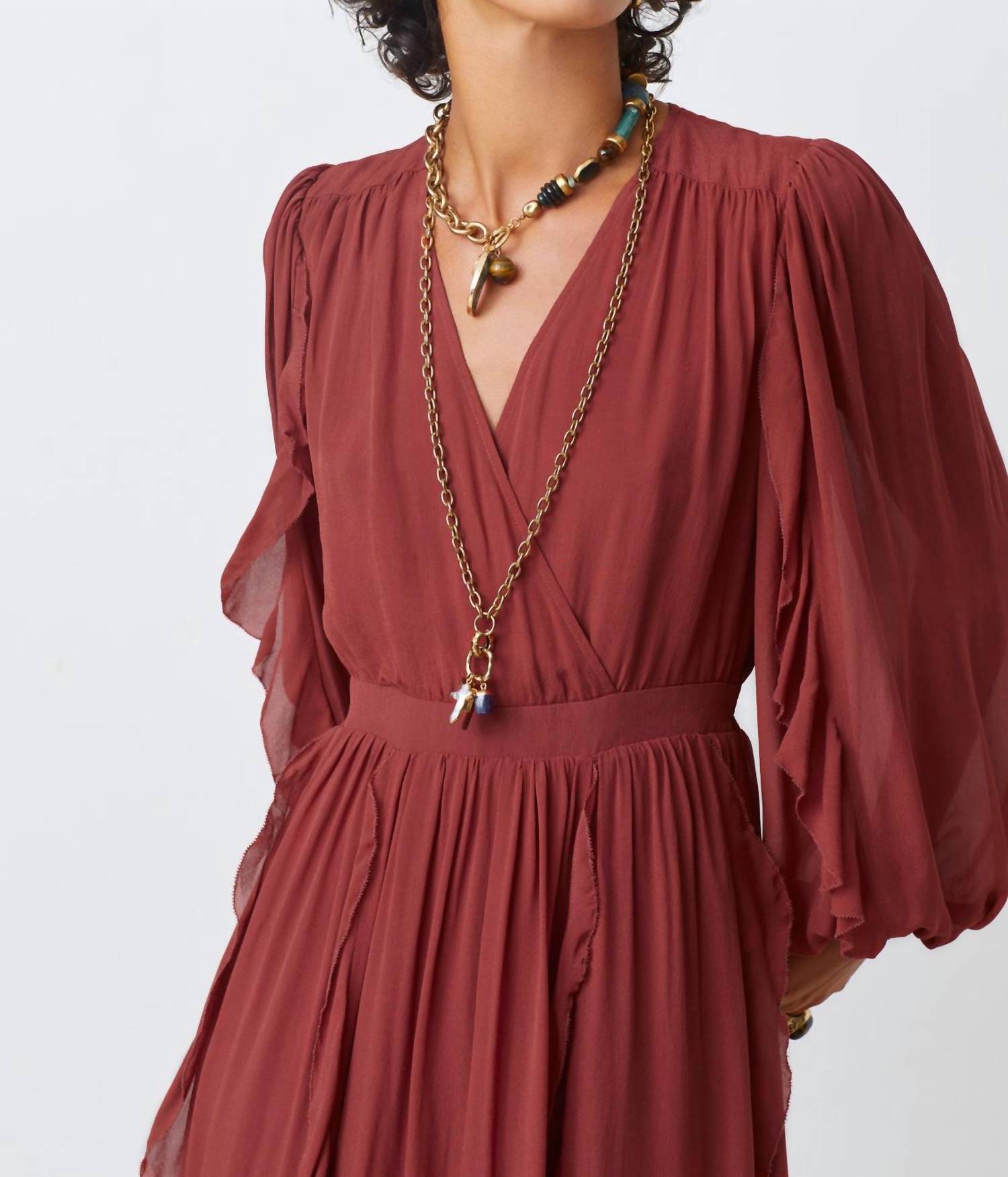 The perfect length dress does exist. Step into bold elegance with the V-neck Midi Dress by Suncoo, a chic terracotta piece for sophisticated evening events. Featuring long sleeves and an A-line silhouette, this dress is designed in a flowing midi length to ensure you move with confidence and grace. Composition: 100% Viscose. Closure: Pull on. Care: Hand wash.
