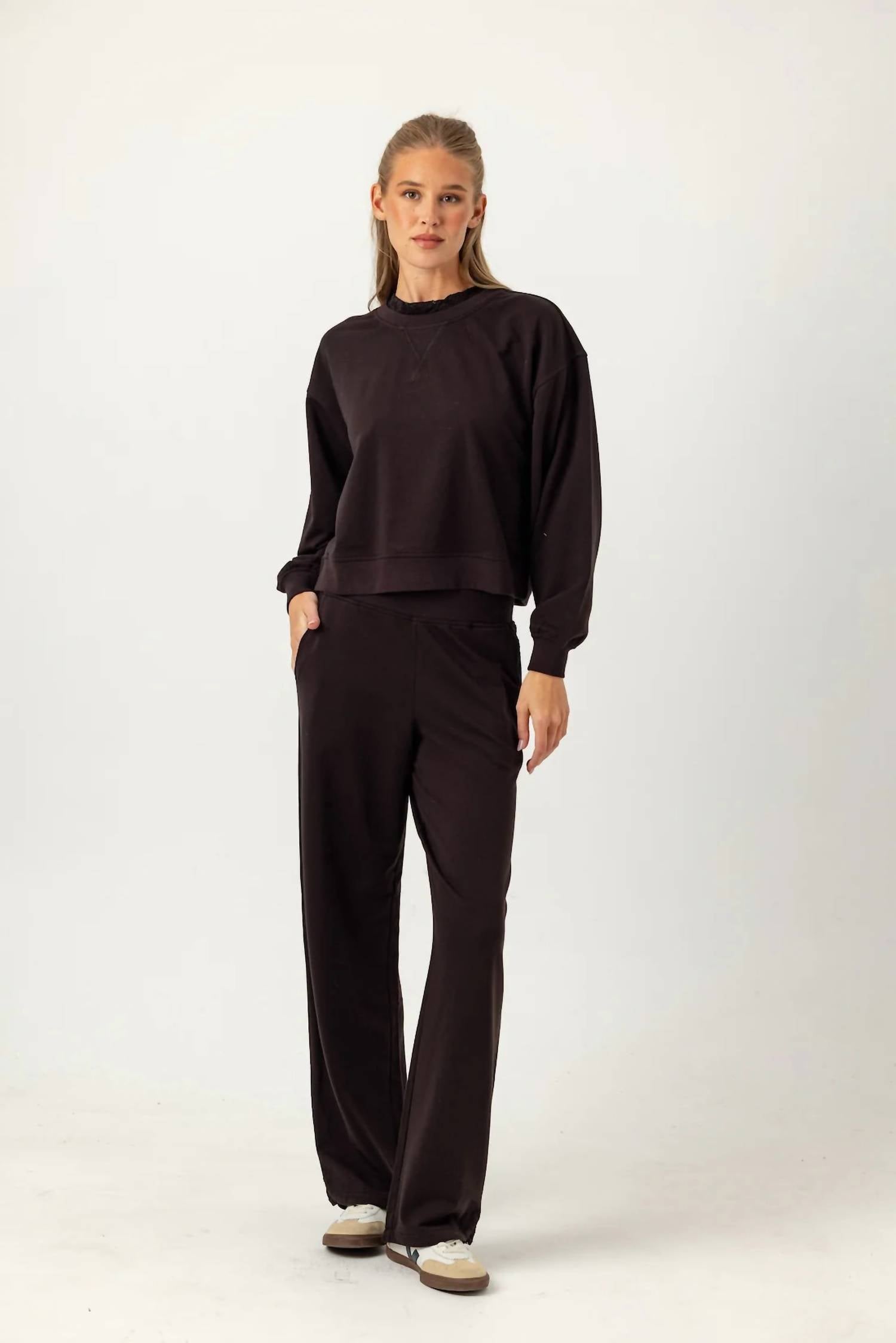 Cooler temps call for layering and we love this adorable sweatshirt for all the obvious reasons. Elevate your fall wardrobe with the Harlowe Pullover by Sundays, a stylish sweatshirt in a rich espresso hue. Crafted from a soft cotton-blend Lux Wash French Terry, this piece features long sleeves and a crewneck with a delicate ruffle lace trim detail. With a classic relaxed fit, rib panels at the side seam, and a ribbed cuff, it offers a slightly cropped silhouette that remains true to size. Composition: 58% Cotton, 37% Polyester, 5% Spandex. Wash cold with like colors. Imported.