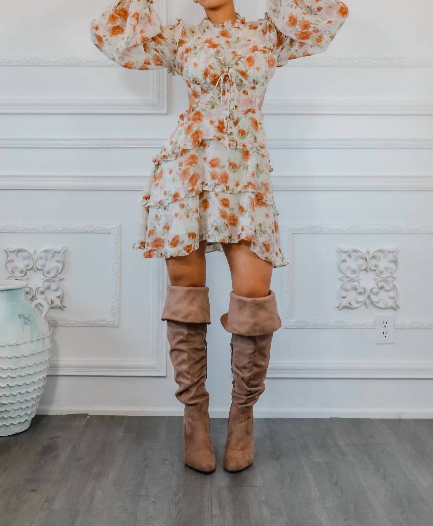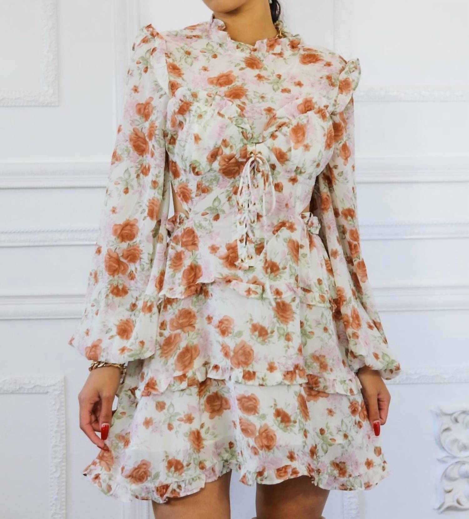 A flattering yet comfortable dress you'll be reaching for season after season. Elevate your cocktail party ensemble with the SurelyMine Bubble Sleeves Floral Cutout Laced Mini Dress. This beige shift dress features long bubble sleeves and a flirty cowlneck, detailed with ruffles and delicate lace. The cutout design and back ties add a playful touch to its Boho Chic appeal, perfect for a springtime look. Closure: Tie closure. Model is wearing a size small.