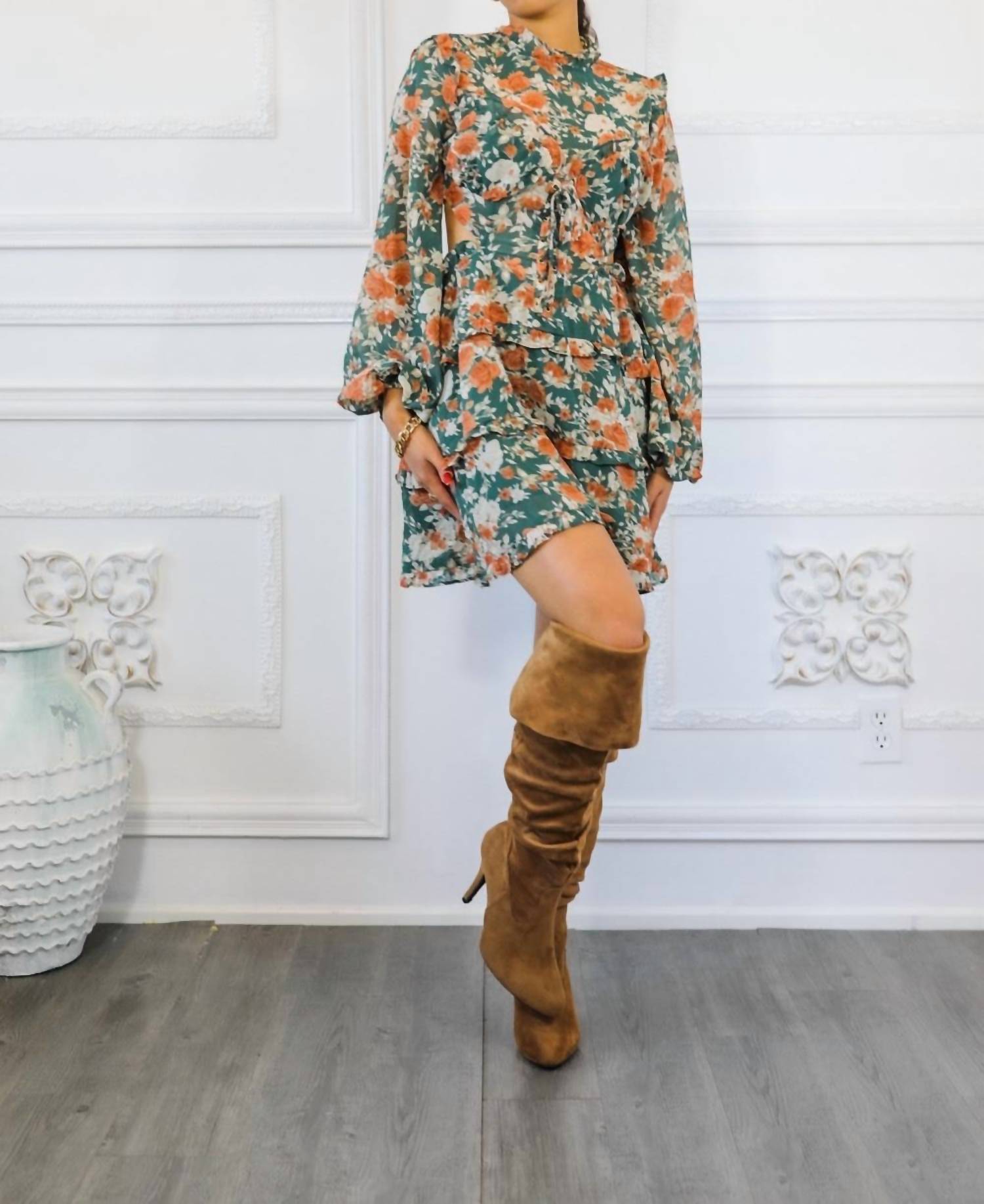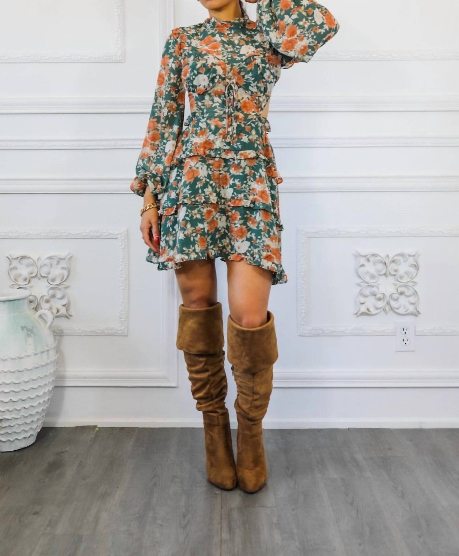 A flattering yet comfortable dress you'll be reaching for season after season. Introducing the SurelyMine Bubble Sleeves Floral Cutout Laced Mini Dress, a chic addition to your wardrobe that perfects bohemian charm. This women's dress, designed for a spring cocktail party, features long bubble sleeves and intricate cutout and lace details for a standout look. The ruffle accents and mockneck design create a flirty, elegant silhouette, enhanced by back ties. With a green floral pattern that radiates boho chic, this shift dress offers a tie closure for a customizable fit. Model is wearing a size small.