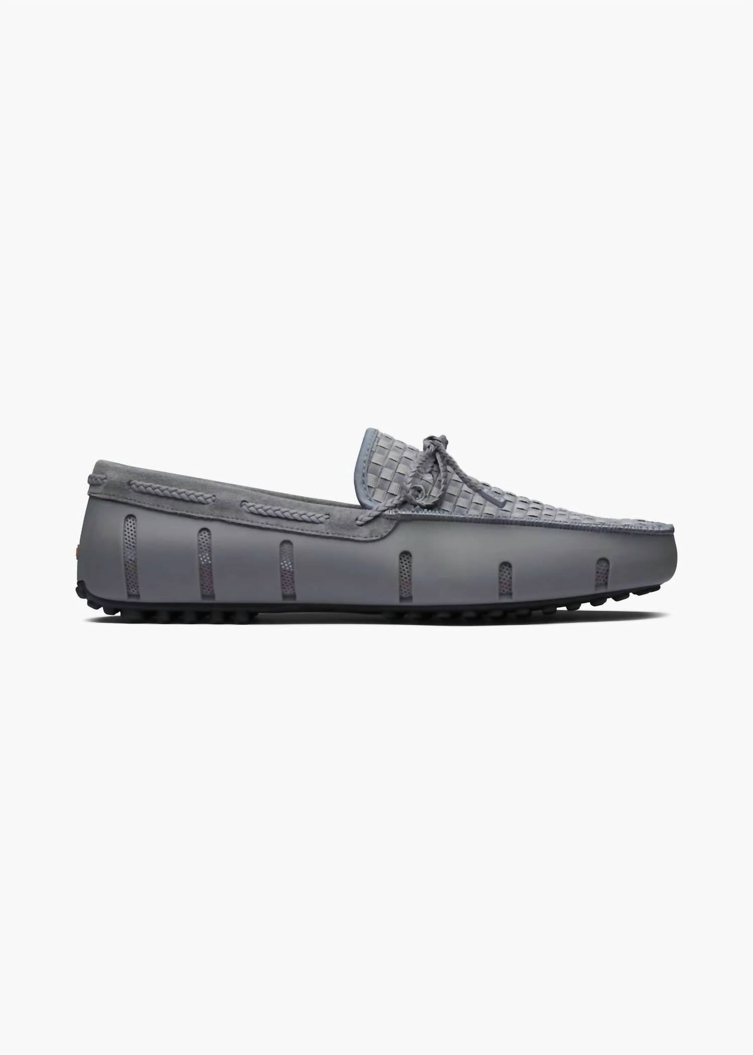 Meet the Men's Woven Driver Loafer by SWIMS, where timeless design meets modern innovation. Crafted from suede, these loafers boast a woven vamp and metal-tipped laces, offering a sophisticated touch in sleek grey. The pebble sole ensures a firm grip, ideal for water-friendly adventures. Care is made easy with a simple hand wash in cold water, air dried in the shade for lasting wear.