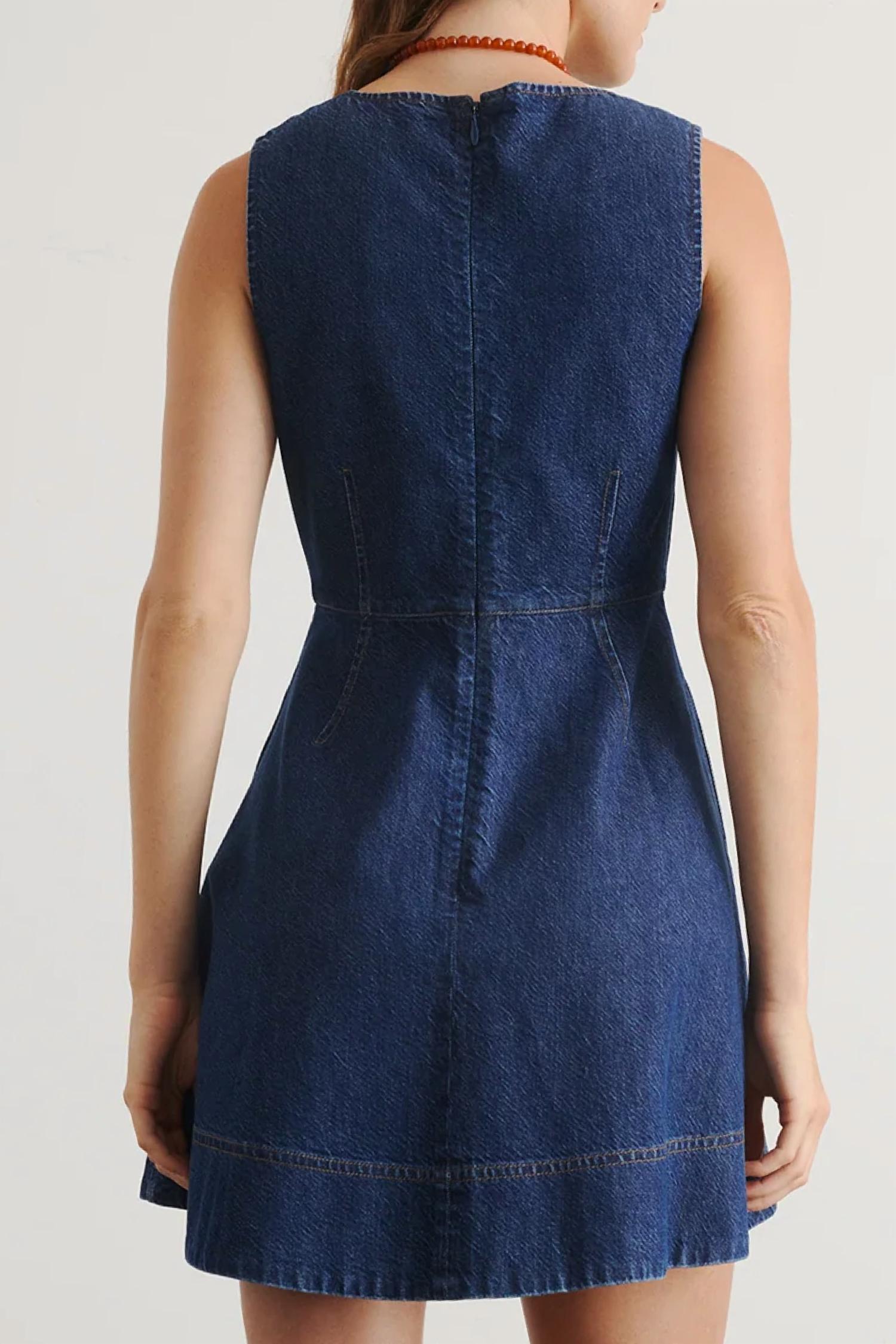 The kind of easy and flattering dress you'll be reaching for all season long. Embrace a touch of elegance with the Nova Mini Dress by Tanya Taylor, a boho-chic piece designed for effortless vacation style. Featuring a sleeveless design with a flattering V-neckline and a tie closure at the center front, this dress exudes charm. The mini length measures 34.5" from the high point shoulder, complete with a lined bodice and center back zipper. Perfectly crafted for spring occasions, its solid blue A-line silhouette is ideal for your next Valentine's getaway.