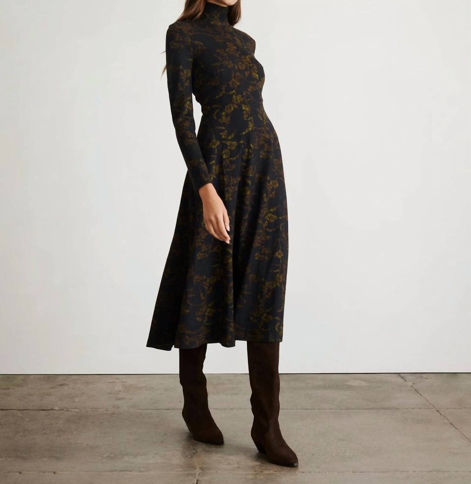 Cute and comfortable, this long sleeve dress has it all. Introducing the Thea Dress by TANYA TAYLOR, a stylish choice for a minimalist vibe in Black/Forest Green. This long sleeve piece, constructed from 65% Rayon, 30% Polyester, and 5% Elastane, features a midi length and an elegant turtleneck. It has a chic paneled skirt with a hidden zipper at the center back for a sleek finish. Care for this patterned ponte dress by dry cleaning only. Agnes, our model, is 5'10" wearing size XS, with the dress measuring 49" from shoulder.