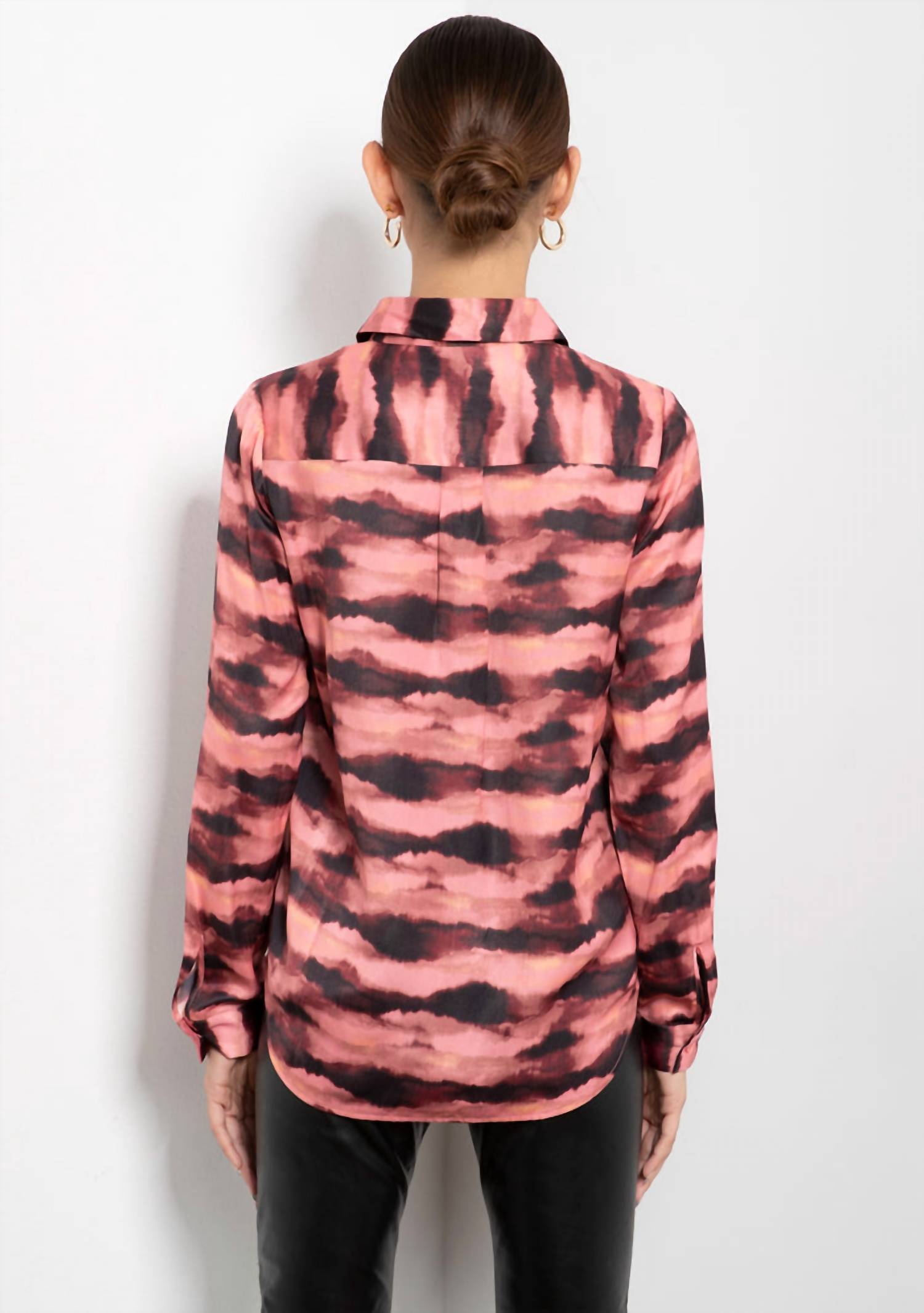 A versatile blouse that works from desk to dinner! Elevate your wardrobe with the Watercolor Sky Button Blouse by Tart Collections, a modern silhouette perfect for any occasion. Featuring long sleeves, this blouse is crafted from 100% Poly Silk Polyester for a luxurious feel. The concealed front button closure adds a sleek touch, while the chest patch pockets provide functionality and style. Care for this garment with a machine wash on a delicate cycle, laying flat to dry; a cool iron may be used if needed. Model is 5'8" and is wearing a size x-small.