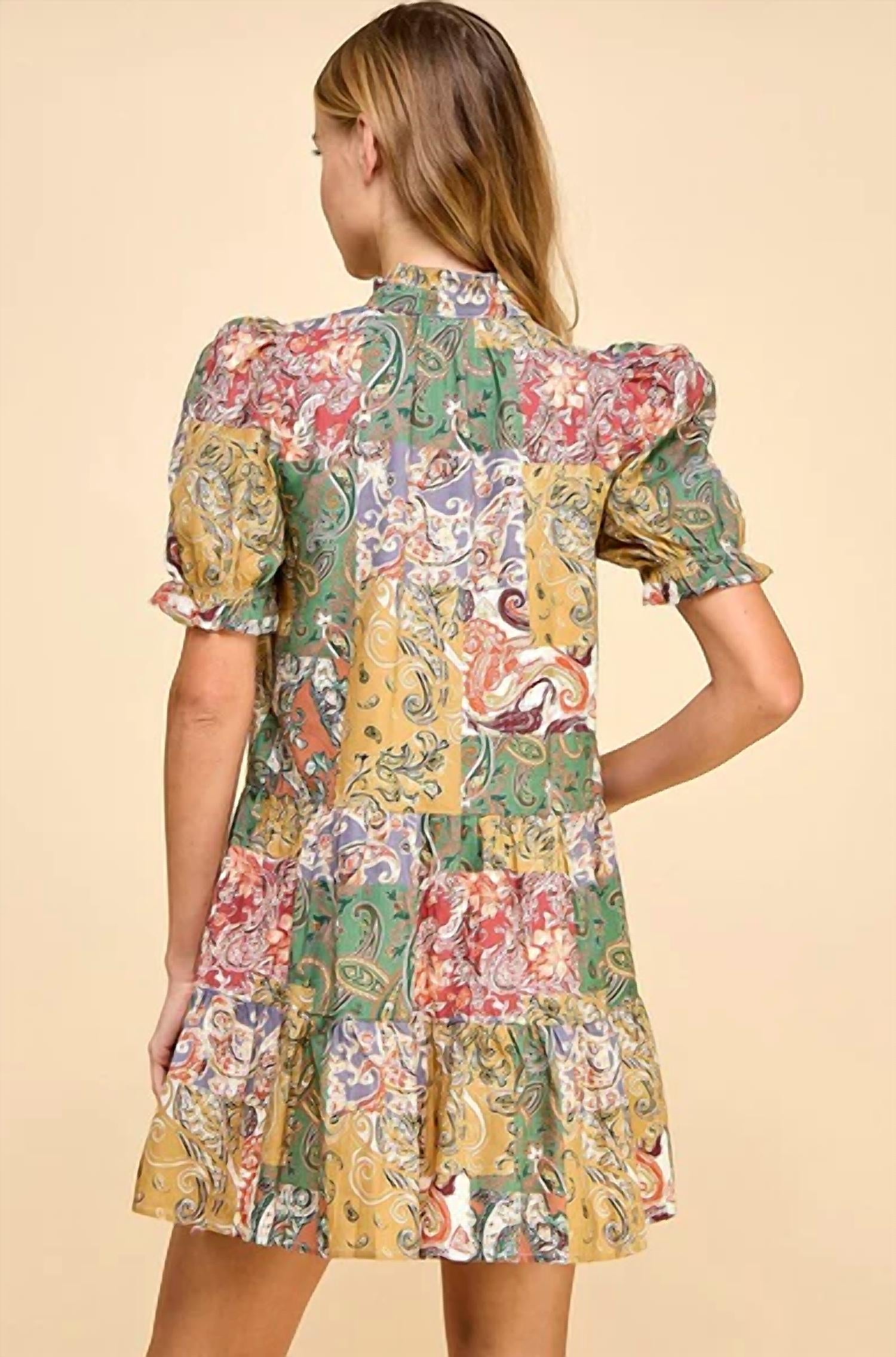 The kind of easy and flattering dress you'll be reaching for all season long. Elevate your wardrobe with the Abstract Print Chic Mock Neckline Dress by TCEC, a stylish mini dress in a vibrant Green Multi color. This piece showcases short puff sleeves and a flattering babydoll silhouette, featuring a mockneck and a unique paisley patchwork pattern. Crafted with a 100% Cotton exterior and a full 100% Polyester lining, it offers both comfort and elegance. Closure: Button closure. Complete your look effortlessly with this fully lined dress measuring 33.5" in length.