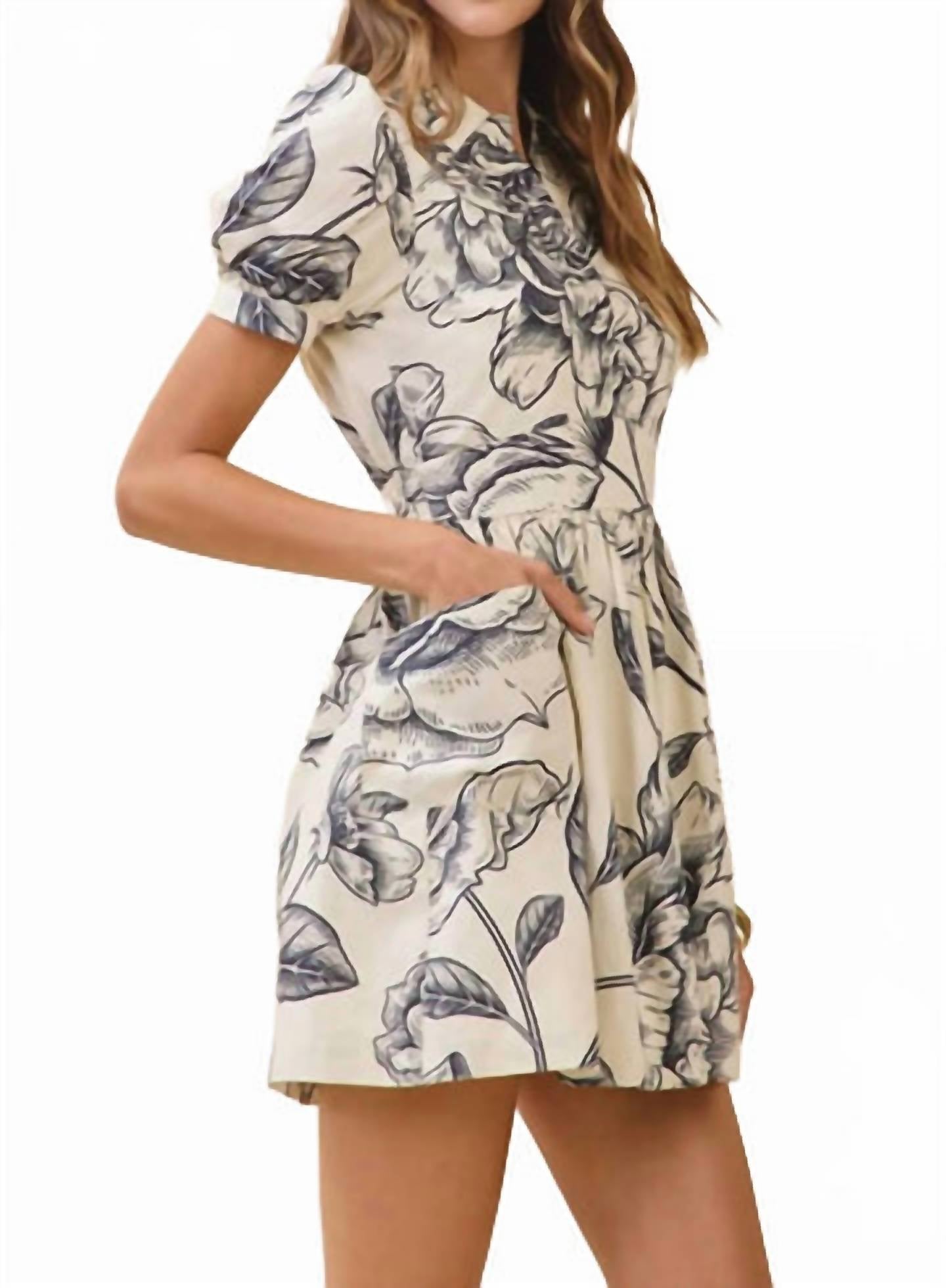 The kind of easy and flattering dress you'll be reaching for all season long. Embrace spring with the Collar Floral Print Mini Dress by TCEC, a must-have for warm-weather wardrobes. Featuring short sleeves and crafted in a boho chic style, this cream and navy mini dress offers an A-line silhouette with a flattering collared neckline. Originating from an unspecified location, it includes a convenient button closure and comes with machine wash care instructions. Perfect for day occasions or vacation getaways, it includes pockets for added functionality.
