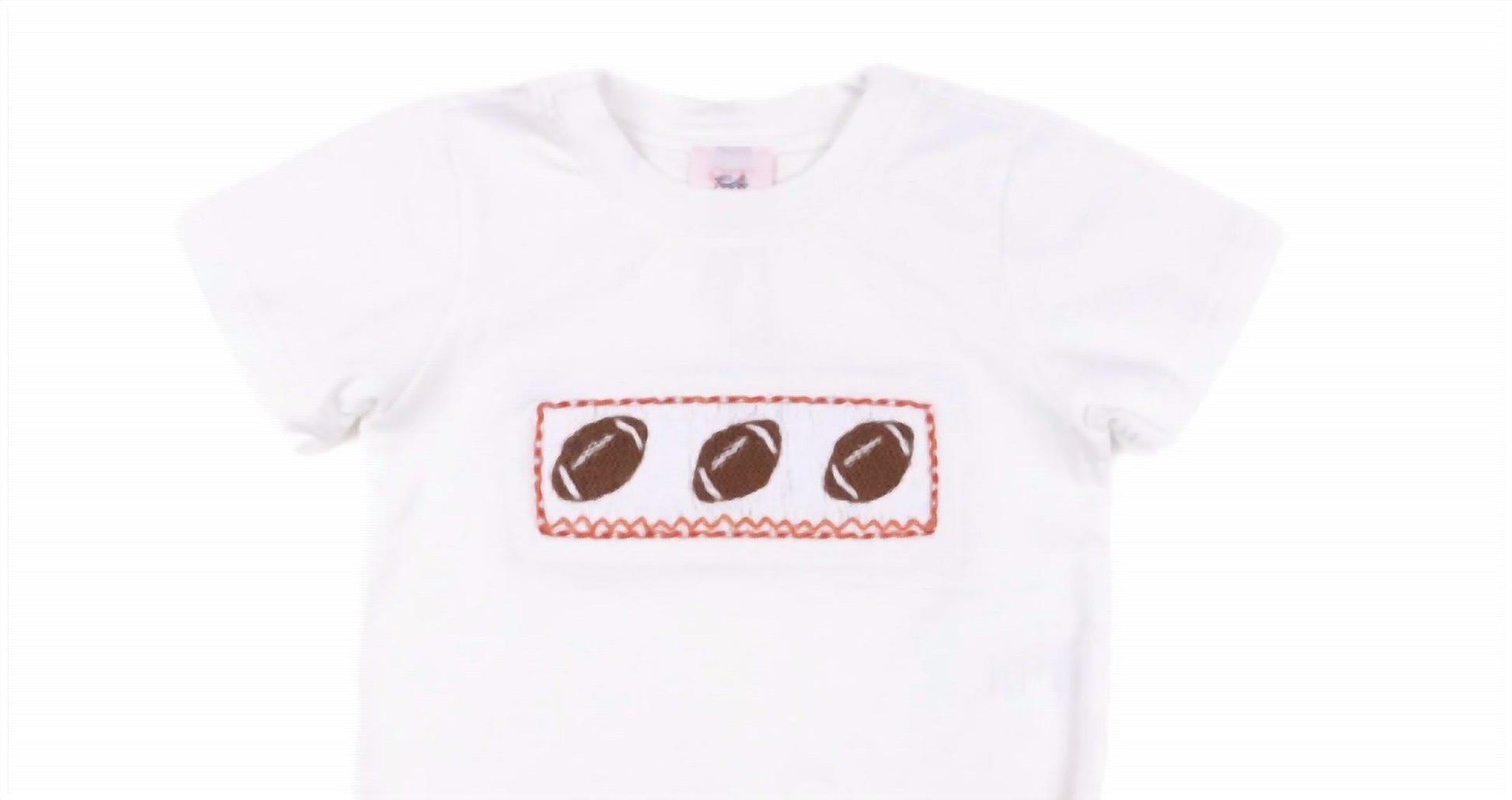 Dress your little fan in style with the Girl's Gingham Smocked Football Wyatt Short Set by Teeta, a delightful matching set perfect for game day. The set features a white short-sleeve tee made from breathable Pima cotton with charming smocked football details, paired with comfortable burnt orange and white gingham shorts. Ideal for active play, this ensemble offers comfort and ease of movement, becoming a favorite in any young wardrobe. Country of Origin details are not provided. For sizing queries, feel free to contact during store hours for exact measurements.