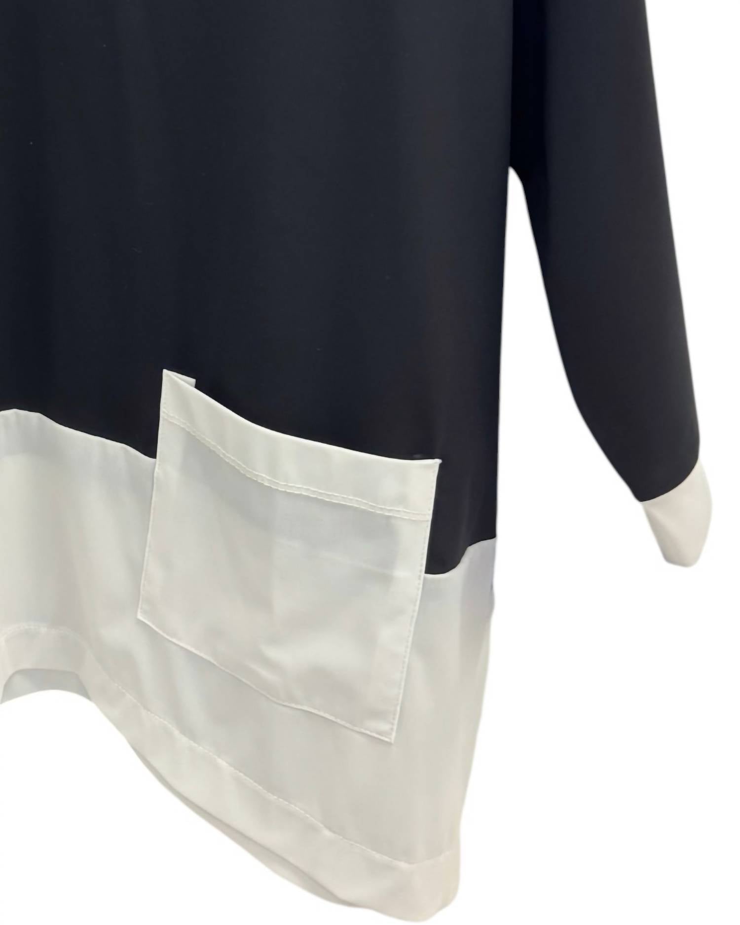 A versatile blouse that works from desk to dinner! Presenting the Women's Modern Contrast-hem Pocket Top by Terra, a chic addition to your fall workwear collection. This black and white blouse features elbow sleeves and a classic crewneck design. It is adorned with practical pockets, making it both stylish and functional. Ideal for occasions like church or as a thoughtful Mother's Day gift.
