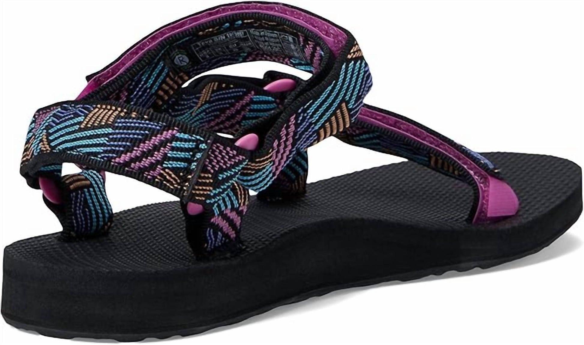 Flowy dresses, cropped pants, and even jumpsuits... this sandal works with them all! Step into comfort and style with the Women's K Original Universal Sandal by Teva. These Borderless Black sandals feature quick-dry webbing made from recycled plastic using REPREVE polyester yarn, and a Universal Strapping System with multiple points of adjustability for a perfect fit. The molded EVA midsole provides heel cupping and arch support, while the durable rubber outsole ensures traction for all-day wear. Ideal for summer vacations and versatile enough for festival or water activities, these sandals are a minimalist's dream.