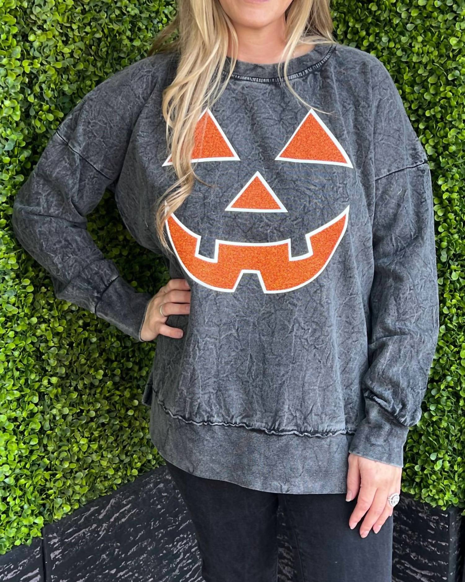 The perfect long sleeve tee that goes with just about anything. Embrace the Halloween spirit with the Glitter Jack O’Lantern Long Sleeve Top by Texas True Threads, a perfect blend of fun and festive. This women's long sleeve top features a standout jack-o-lantern graphic on a black mineral wash. The top is designed with a crewneck and a pull-on closure for easy wear. Ideal for the fall season, it's perfect for holiday parties with a nod to 90s fashion trends.