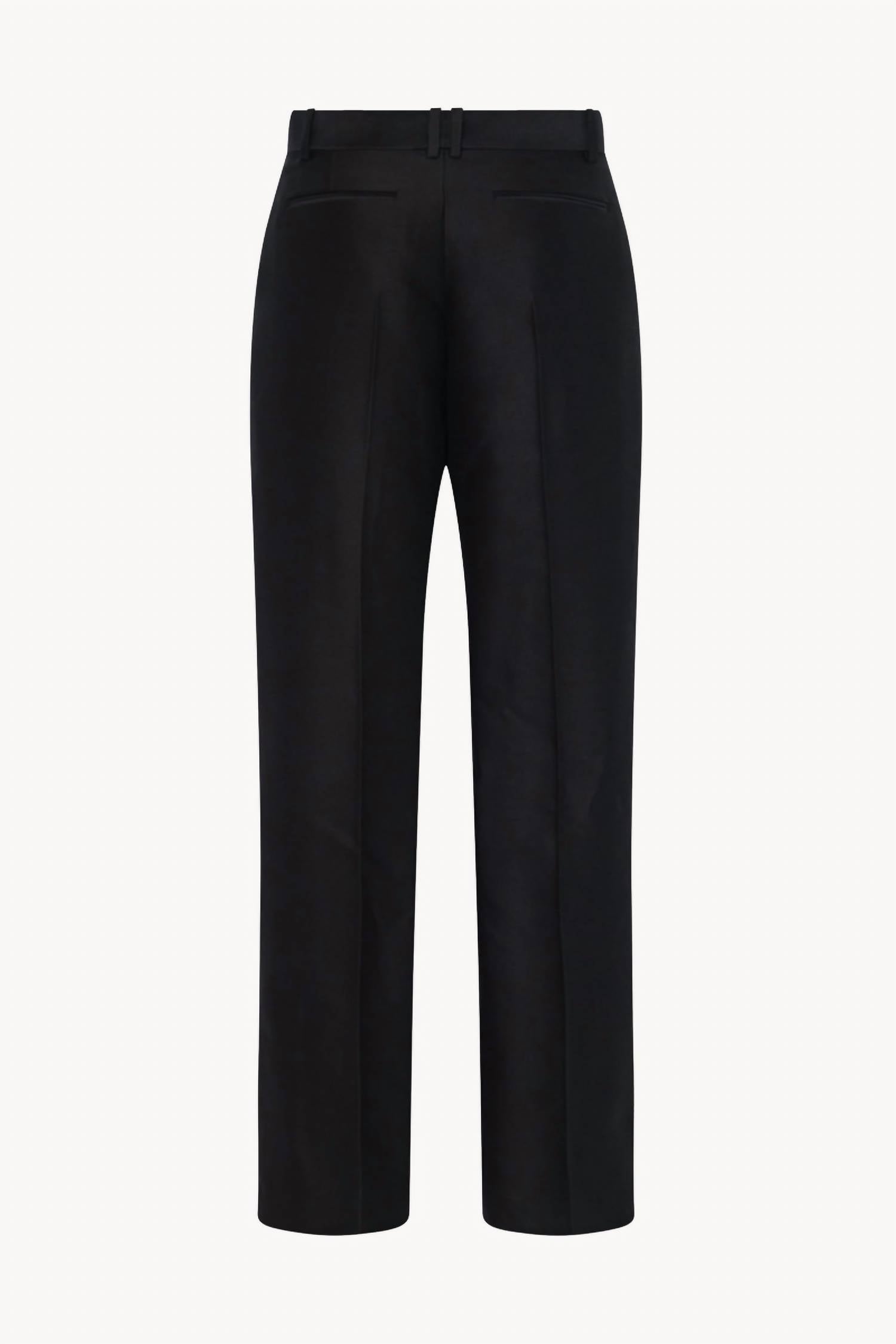 Introducing the Alaric Pant by The Row, an elegant blend of sophistication and comfort for women. These mid-rise, straight-leg trousers are exquisitely crafted from a 77% wool and 23% silk blend, offering a luxurious feel and lightweight suiting experience. Designed with pressed front and back creases, they feature side seam and back besom pockets for practicality. Made in Italy, these black trousers ensure style and function with a secure zip closure.