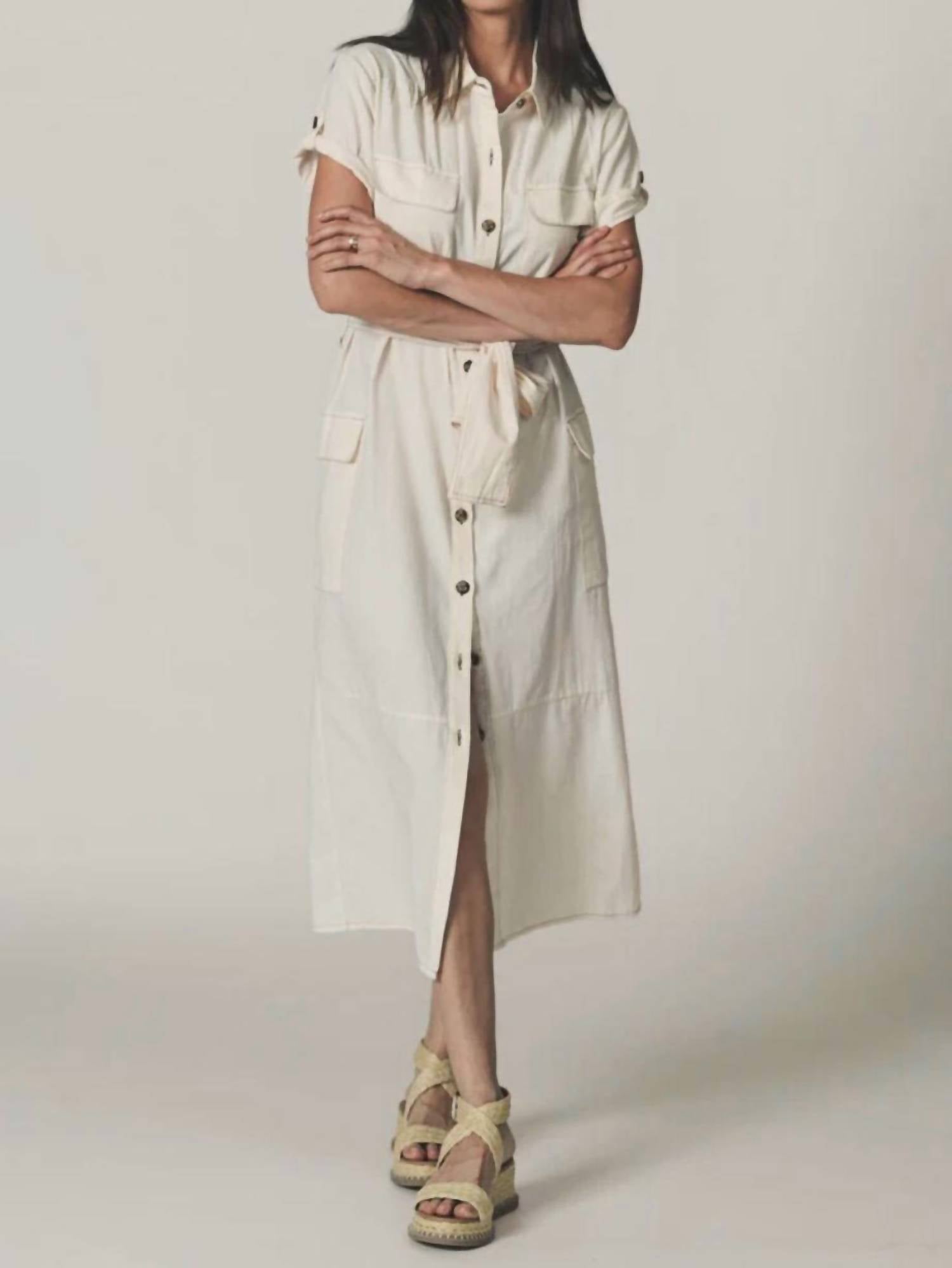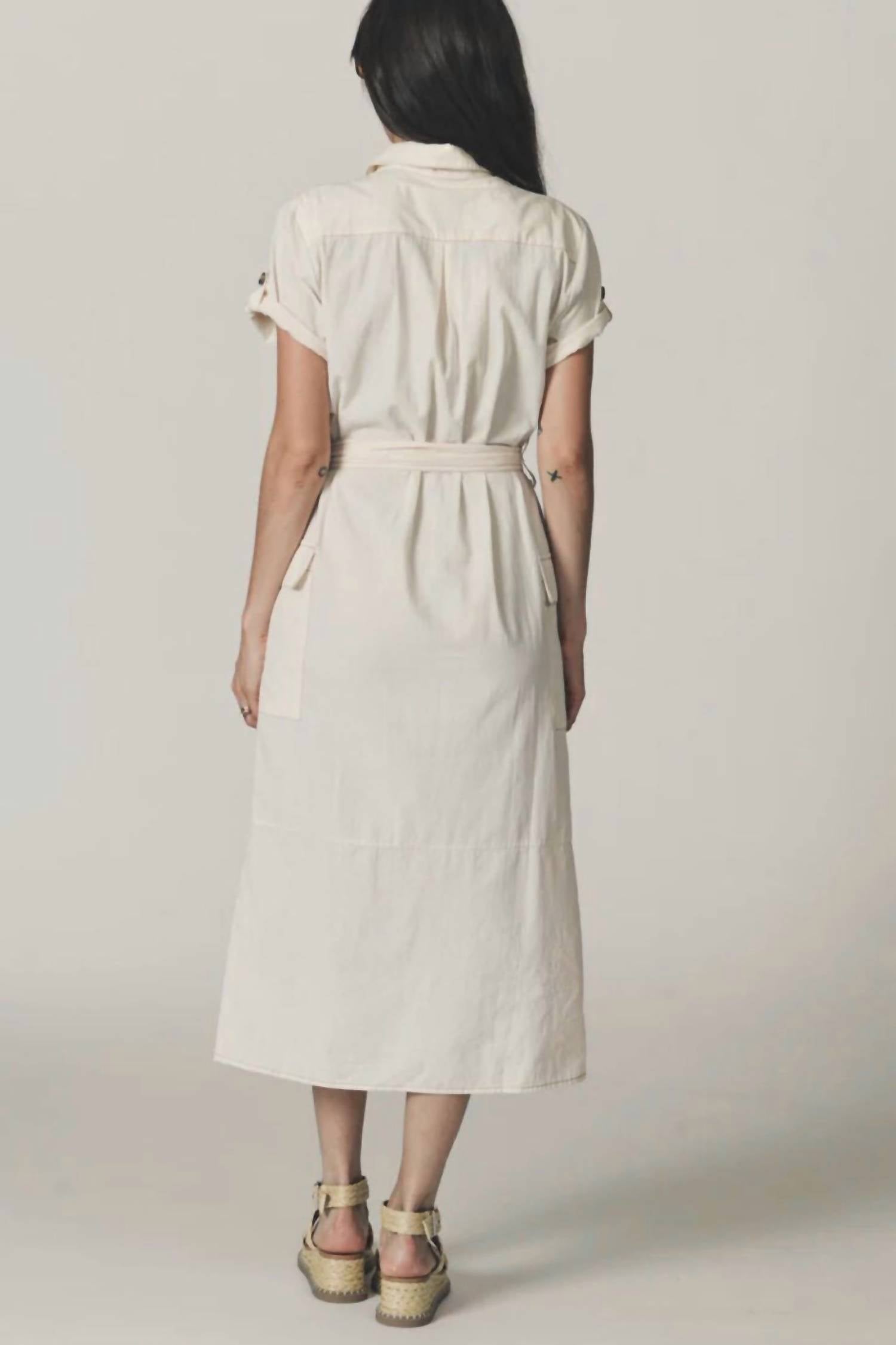 The perfect length dress does exist. Meet the Whitney Midi Dress by THE SHIRT, the perfect one-and-done piece for your wardrobe. Designed in a sleeveless silhouette with optional tab sleeves, this shirt dress is crafted from 100% cotton in an elegant ecru color. It features a classic collar neckline, button closure, and decorative patch pockets, all accented with beautiful brown topstitching. The dress comes with a removable self-belt for a personalized fit, ideal for summer dinner parties.