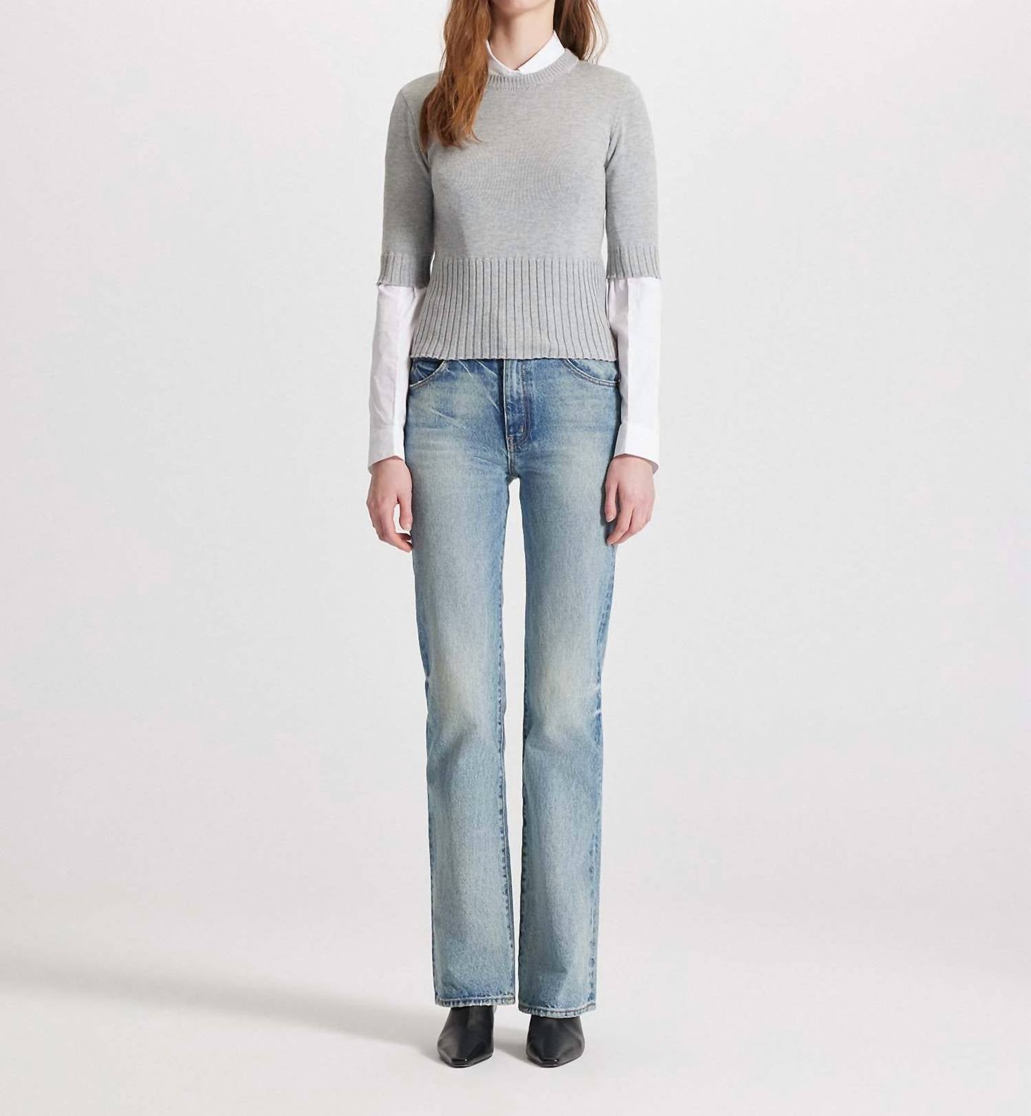 The short sleeve tee you'll want in every color. Introducing the Women's Nomia Ribbed Waist Crew Sweater Top by THEO the Label, a stylish staple in heather grey. Featuring long sleeves and a ribbed texture, this top is designed for versatility with a pull-on closure. Its fitted design and wide waistband define the silhouette, making it ideal for layering or standalone wear. Perfect for a spring vacation or streetwear look, this piece complements skirts and pants effortlessly.