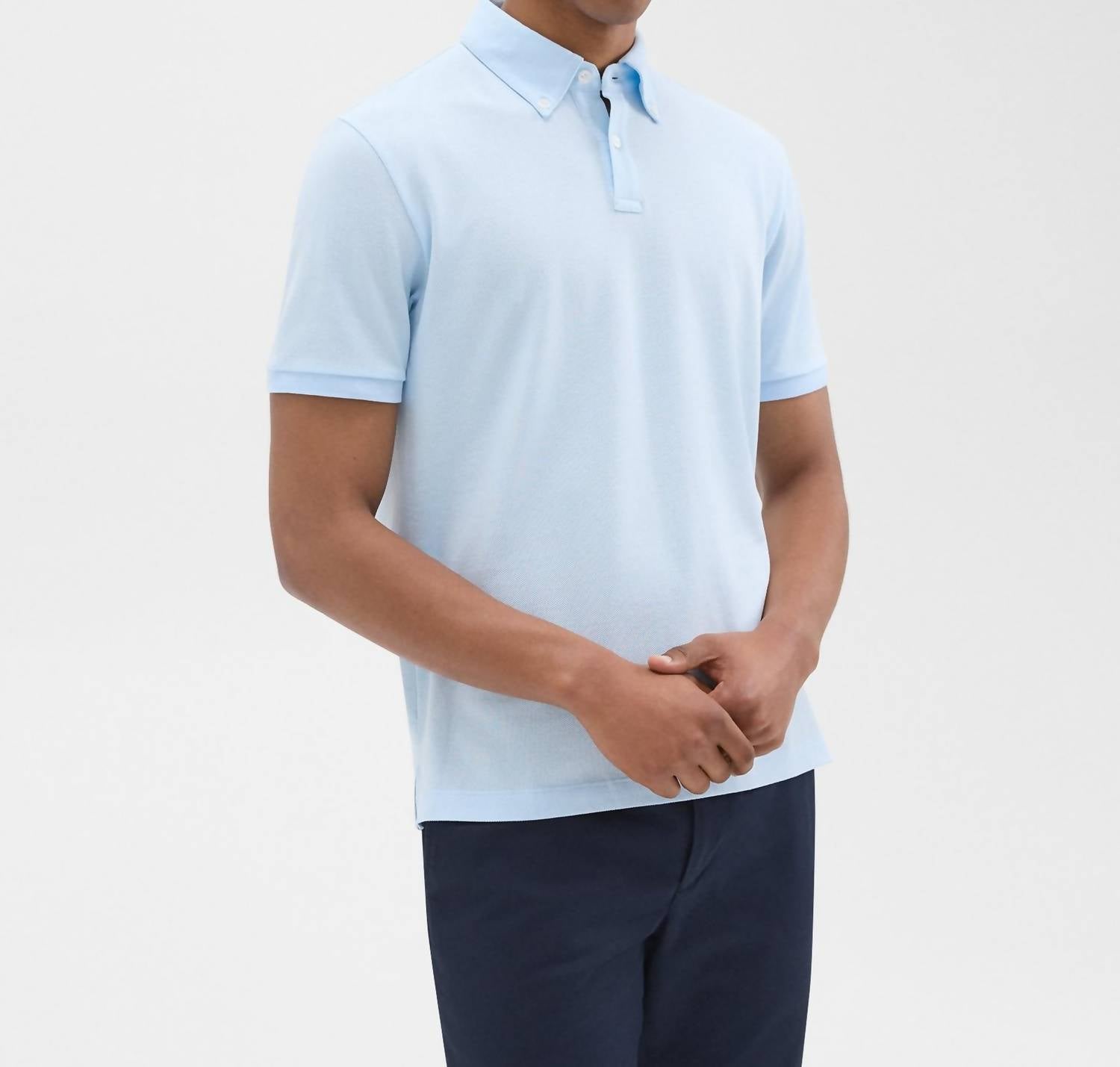 Introducing the Tailored Function Piqué Polo Shirt by Theory in a serene Skylight hue, a masterpiece of comfort and style. This polo features short sleeves, crafted with a breathable stretch Pima cotton blend in a piqué texture. Its streamlined design boasts a standard fit and a pointed collar with a two-button placket for a refined finish. Composition: 97% Pima cotton, 3% spandex. Care: Machine wash and lay flat to dry.
