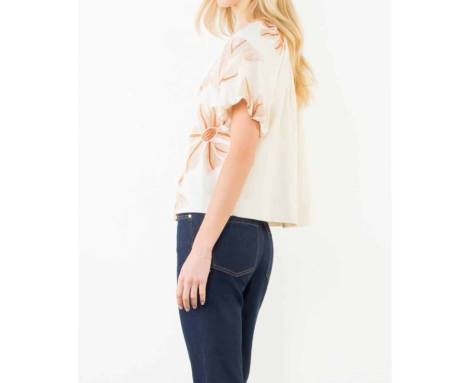 A versatile blouse that works from desk to dinner! Immerse yourself in feminine charm with the Alex Puff Sleeve Blouse by THML, featuring intricate floral embroidery that adds a touch of elegance to any outfit. Crafted from 100% Cotton, this blouse offers breathability and comfort in a beautiful white hue. The short puff sleeves and crewneck design enhance its versatility, making it a perfect fit for summer events like Easter or an engagement occasion. Care instructions include machine wash and tumble dry, ensuring effortless maintenance for your wardrobe.