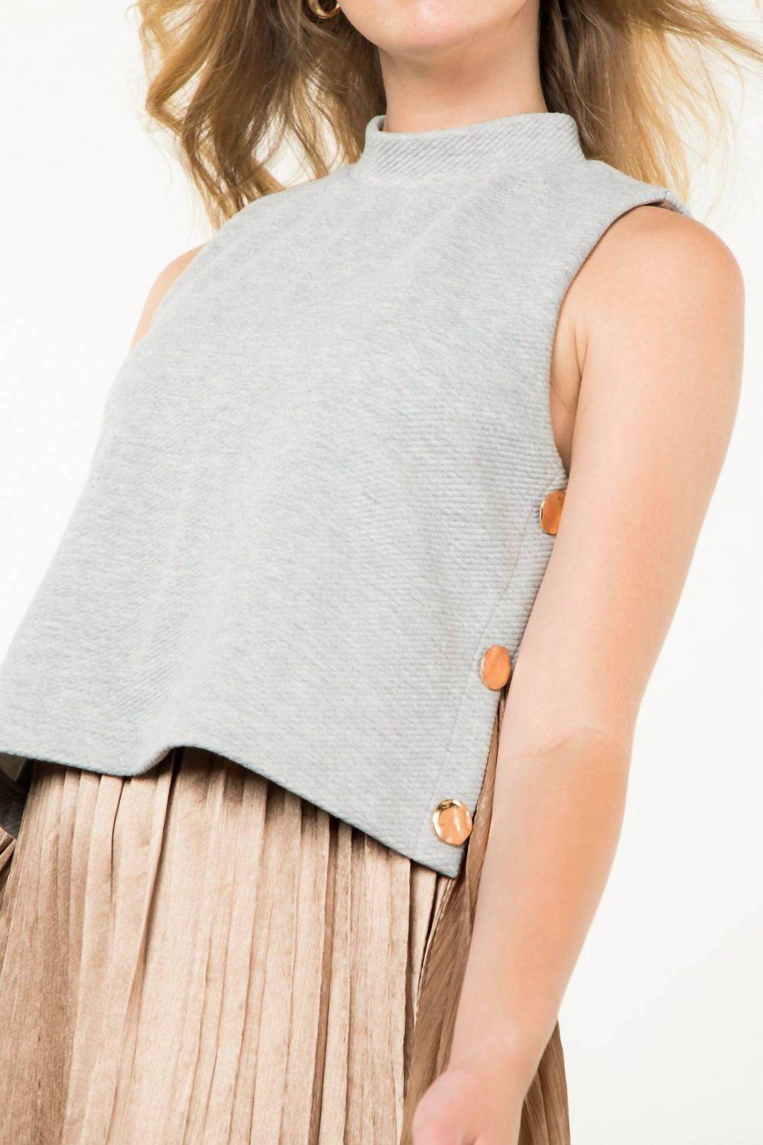 Just add slides or mules and you are good to go. The THML Chic Pleat Frock Midi Dress, perfect for spring evening events, showcases a sophisticated A-line silhouette in a solid gray color. With its sleeveless design and mockneck, this dress embraces the trend of quiet luxury seamlessly. Closure: Eye-catching gold buttons.