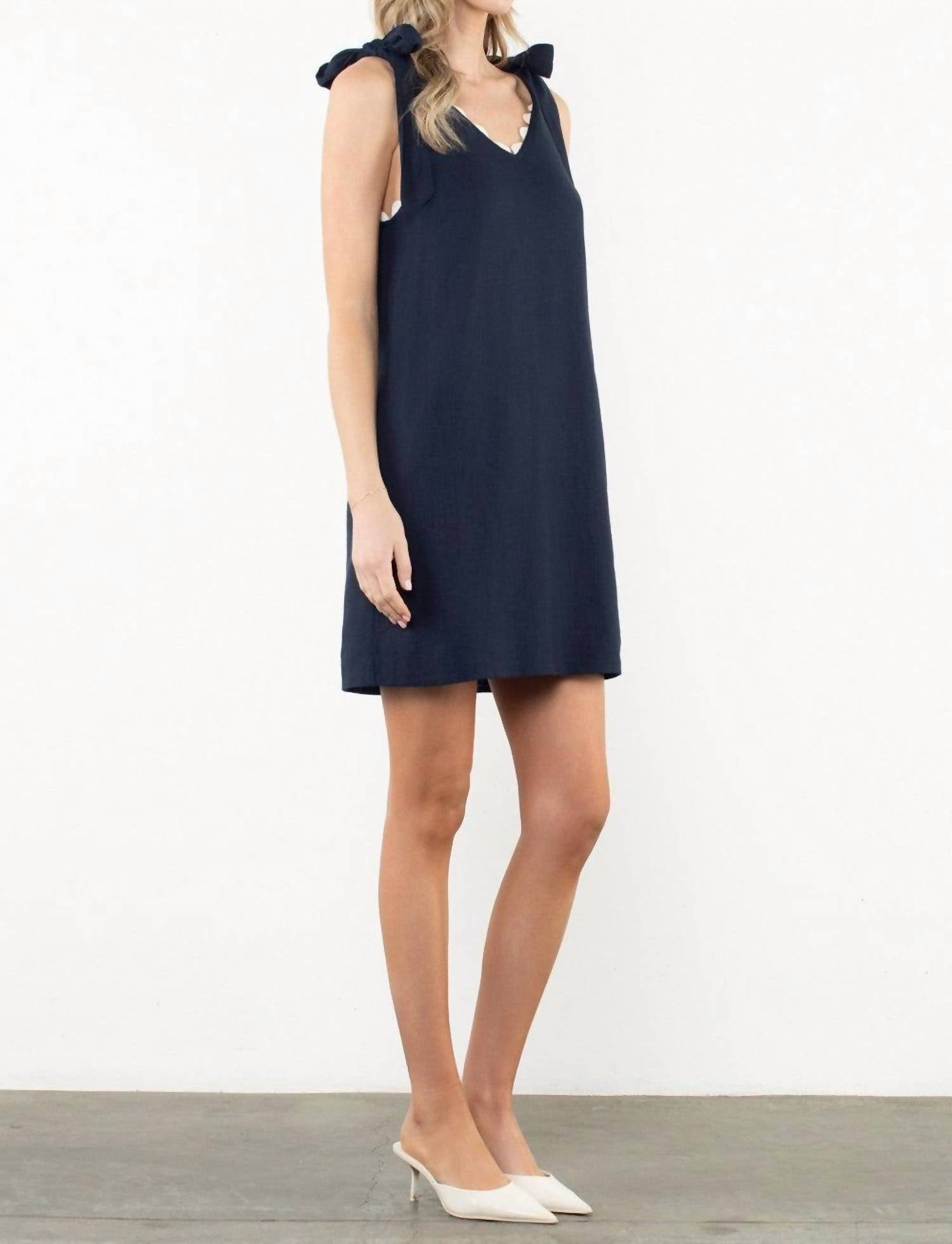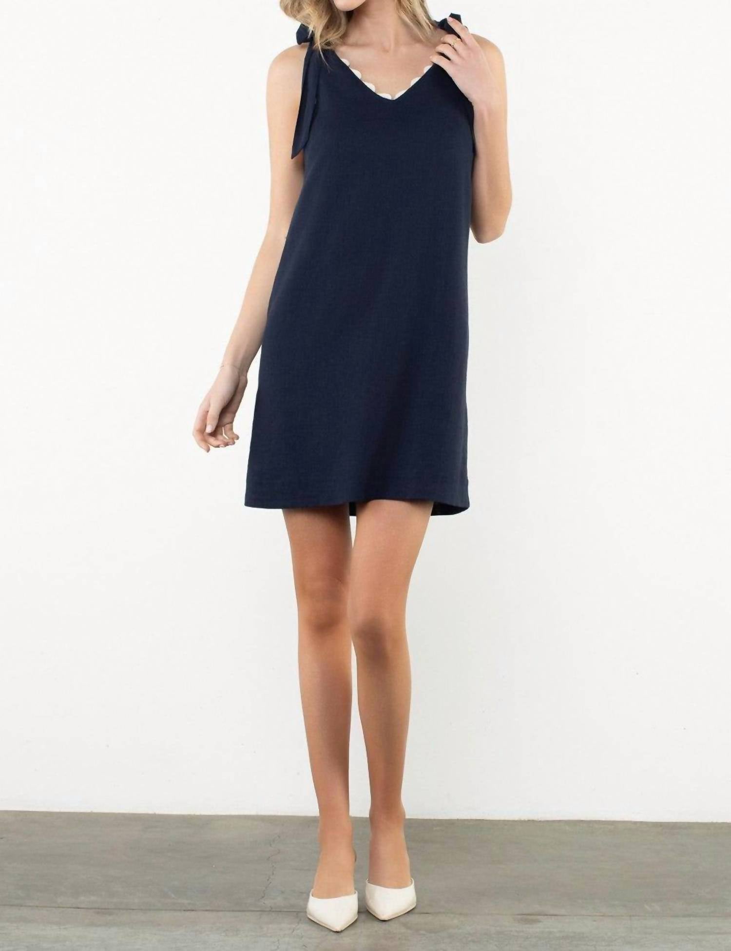 Cute and comfortable, this long sleeve dress has it all. Embrace timeless elegance with the THML Eleanor Tie Shoulder Mini Dress in a captivating navy hue. This sleeveless sheath dress is crafted from lightweight rayon, making it an ideal choice for summer holiday parties. The design features a graceful V-neckline with scalloped trim and delicate tie straps, ensuring a refined appearance. Closure is a convenient pull-on style.