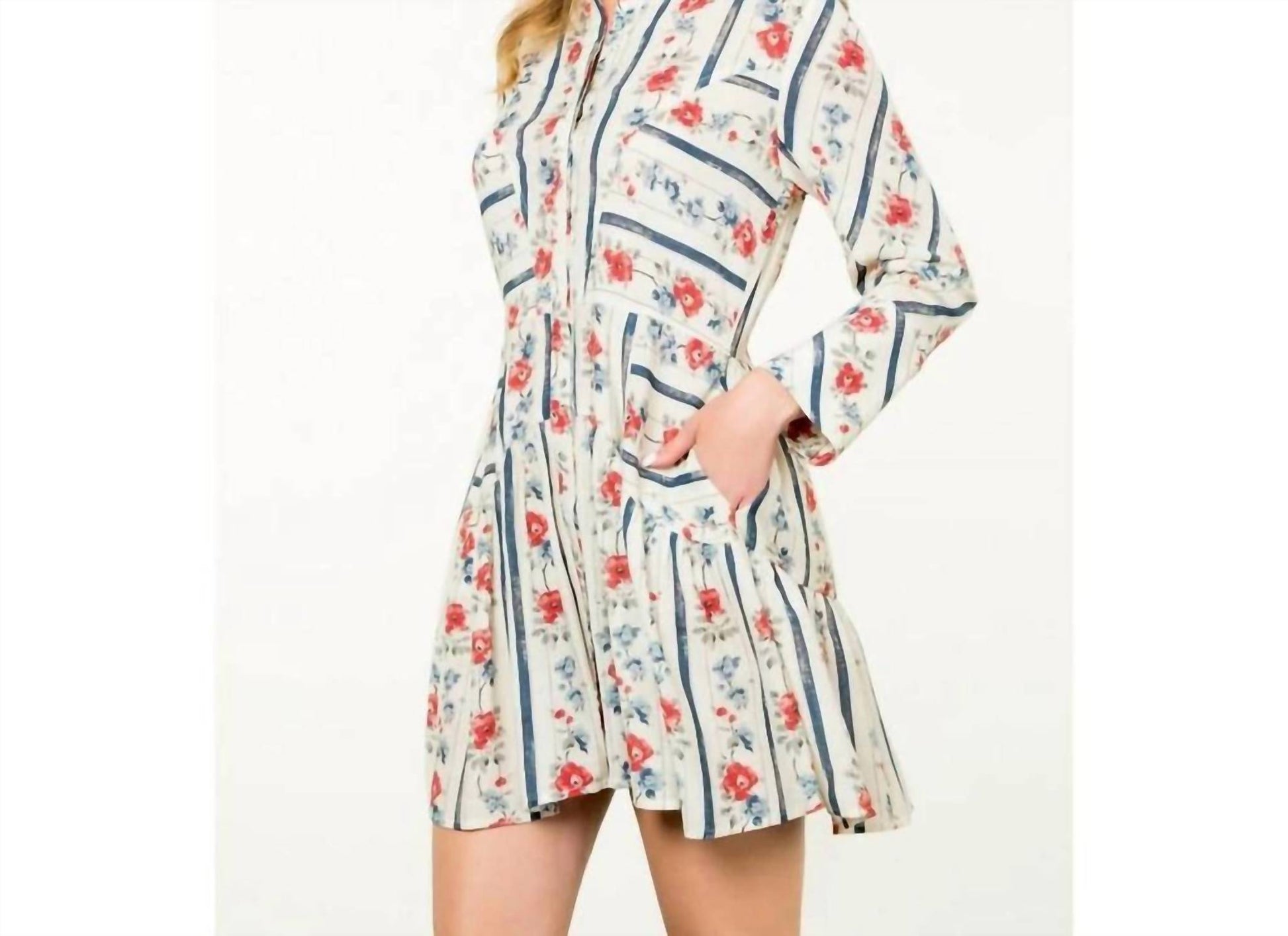 A short and breezy dress for those warmer days. Step into spring with the Long Sleeve Floral Dress by THML, a romantic A-line mini silhouette perfect for vacation getaways or Valentine's Day celebrations. Featuring a V-neck and long sleeves, this cream floral pattern embraces a maximalist trend with effortless style. The dress includes convenient pockets and a button closure for added functionality. Made for easy care, simply machine wash and line dry to enjoy its beauty season after season.