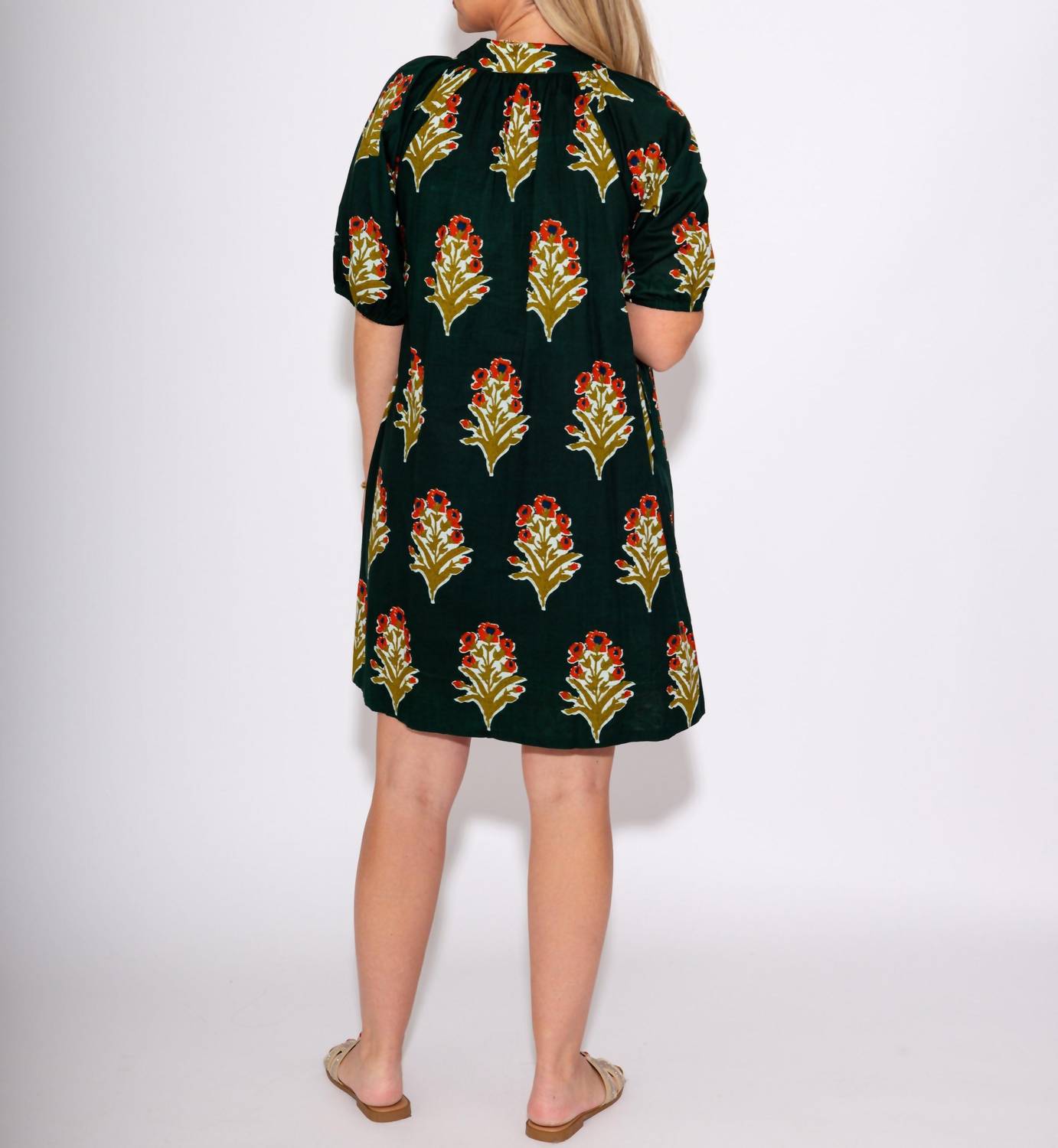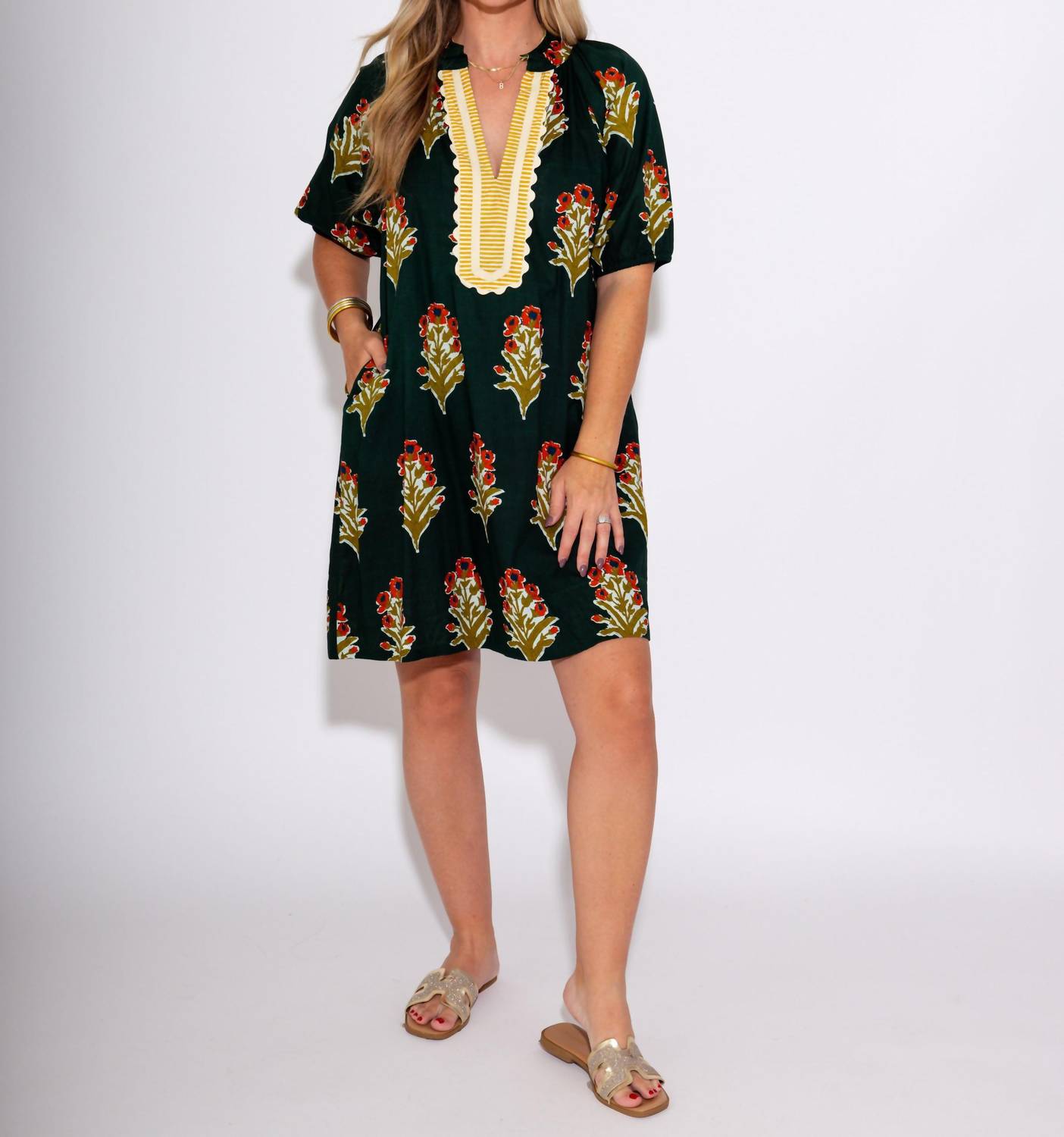 The kind of easy and flattering dress you'll be reaching for all season long. Elevate your wardrobe with the Petal Stripe V-Neck Dress by THML, a stunning mini dress perfect for any occasion. This short sleeve, A-line silhouette showcases a deep green, patterned fabric with vibrant floral designs, complemented by playful striped details. Ideal for the boho chic trend, it's perfect for spring outings or Thanksgiving gatherings. Care for this vacation-ready dress by hand washing and line drying to maintain its breezy charm.