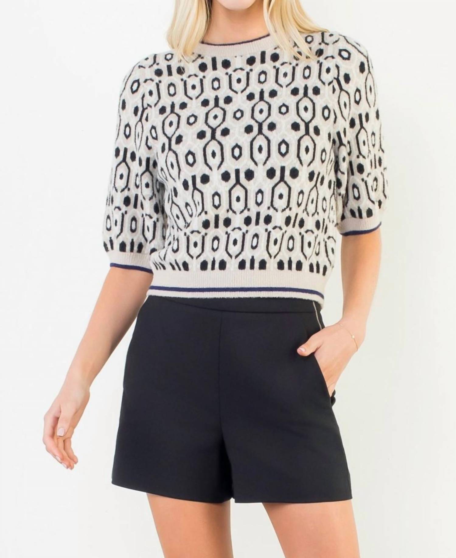 Stay warm and stylish in this versatile and effortlessly cool knitwear staple. Wear it alone or layered, it's the perfect sweater for the season and you'll wish you had it in every color. Elevate your wardrobe with the Short Sleeve Abstract Sweater by THML, a chic option for any dinner party. Featuring a geometric pattern in beige and black, this preppy crewneck is crafted from 100% nylon knit for a comfortable fit. The sweater measures 20 3/4 inches in body length, with a bust width of 34 inches and sleeve length of 13 inches, ensuring it complements a woman's silhouette effortlessly. Closure: Pull on. Model is wearing size S (5'9" height, 32" bust, 25.5" waist, 36" hips).