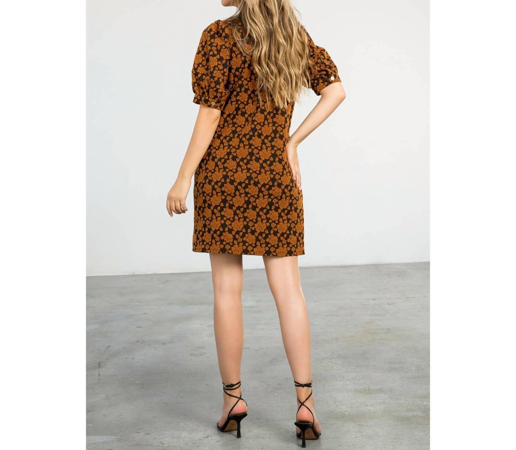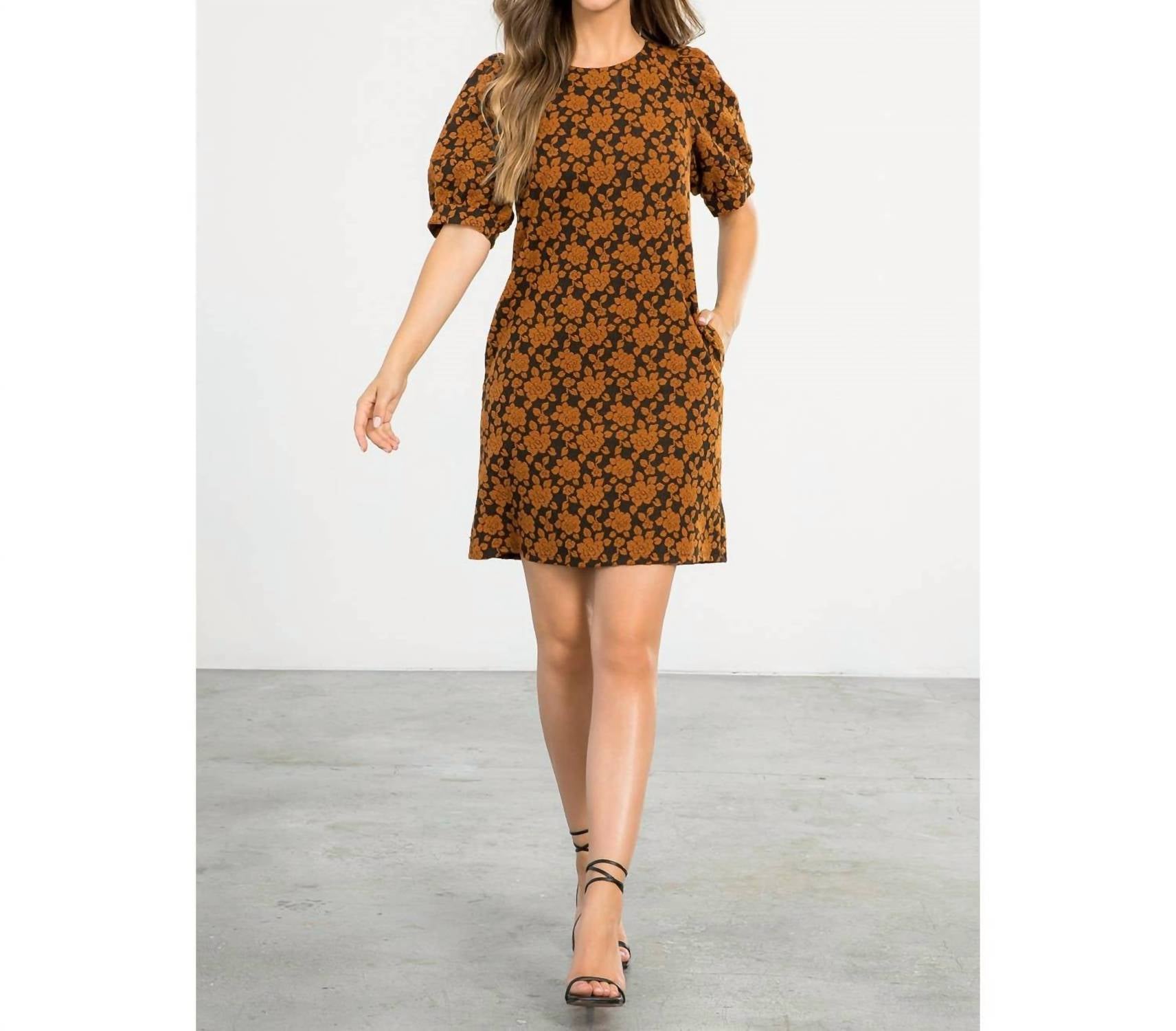 The perfect mini dress for those warmer months. Introducing the THML Textured Dress with Puff Sleeves, a chic addition to your spring wardrobe. This women's mini dress features short puff sleeves and a floral print on a black knit fabric, composed of 98% Polyester and 2% Spandex. Garment length measures 35 inches, designed in the USA, with convenient pocket detailing for added functionality. Care is straightforward with machine wash instructions, making it perfect for a boho chic, holiday party look. Model wears a size S (5'9" height, 32" bust, 25.5" waist, 36" hip).