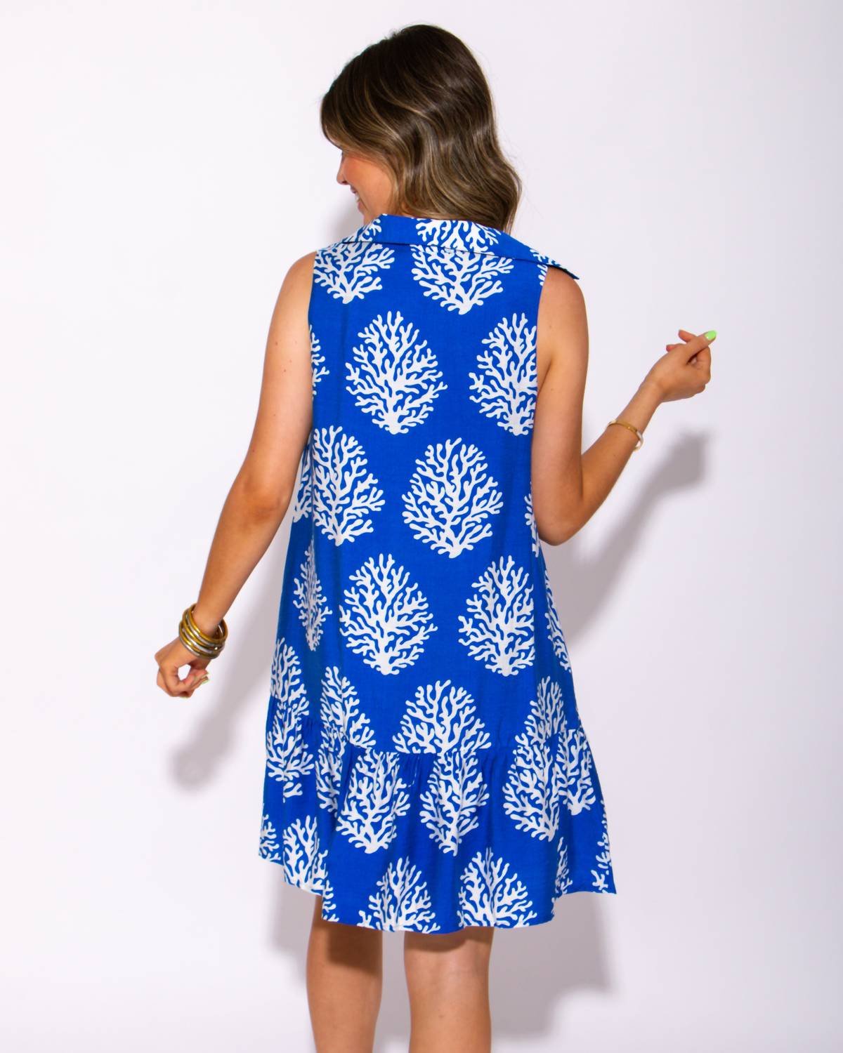 Comfortable and cute, this casual day dress has it all. Introducing the Women's Coral Coast Flutter Mini Dress by THML, a must-have for effortless coastal chic style. This sleeveless shift dress features a bright royal blue background with a delicate white coral print and a striped collar for a crisp nautical touch. The dress is designed with a v-neckline and a fluttered skirt, offering a breezy and feminine silhouette. Closure: Button closure, perfect for sunny getaways and seaside dinners.