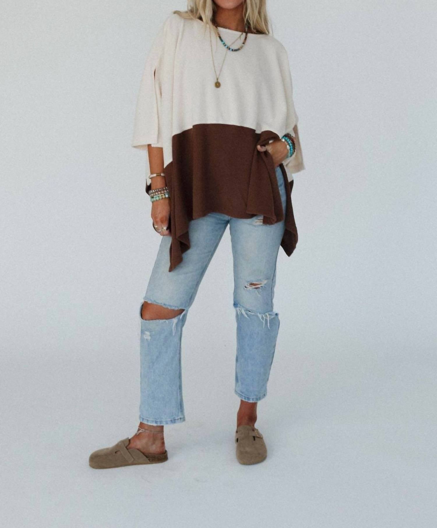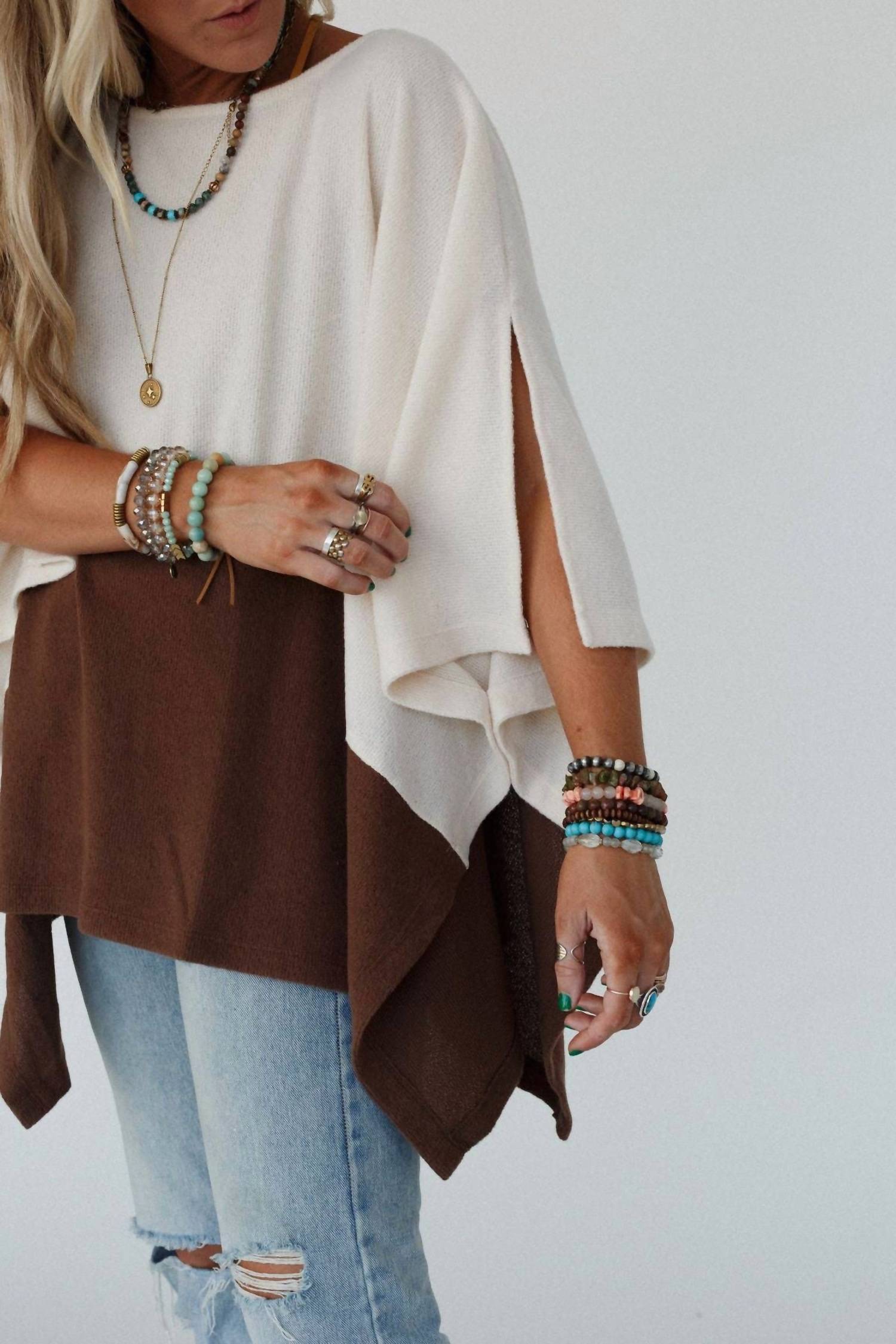 A versatile blouse that works from desk to dinner! Introducing the Lucky Shadow Top by Three Bird Nest—a boho chic essential designed for versatile vacation wear. This elbow sleeve blouse is crafted with a color block pattern, offering a cozy oversized fit with a flattering V-neckline and flowy short sleeves. Its composition includes 28% Rayon, 68% Polyester, and 4% Spandex, ensuring a lightweight and stretchy feel. Made in the USA, it features a convenient pull-on closure and requires hand washing and laying flat to dry. Available in a rich brown color, the top also includes side slits for added style and comfort. Available sizes range from Small to X-Large, with varying measurements to ensure a comfortable fit.