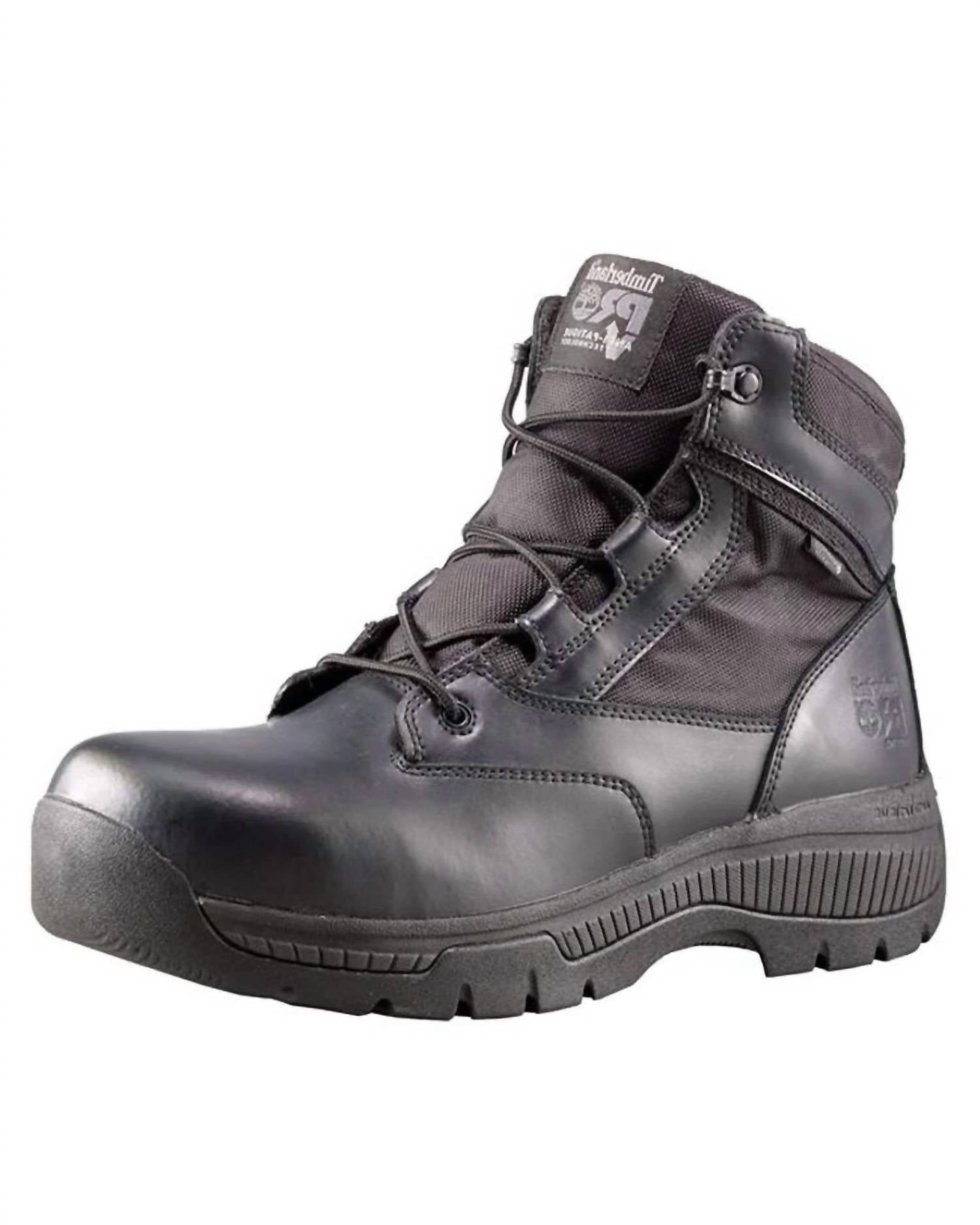 Introducing the Timberland Men's Valor Duty 6" Soft Toe Work Boots, engineered for durable comfort and performance. Crafted from black smooth leather and 1200-denier ballistic nylon, these boots feature a waterproof membrane and are imported. They include a lightweight molded EVA midsole and a non-marking Timberland PRO rubber lug outsole that is slip-, oil-, and abrasion-resistant. With metal detector-friendly hardware and a Scotchgard protector by 3M, these boots are ready for any workwear challenge. Single boot weight for size 9: 675 grams/1.49 pounds.