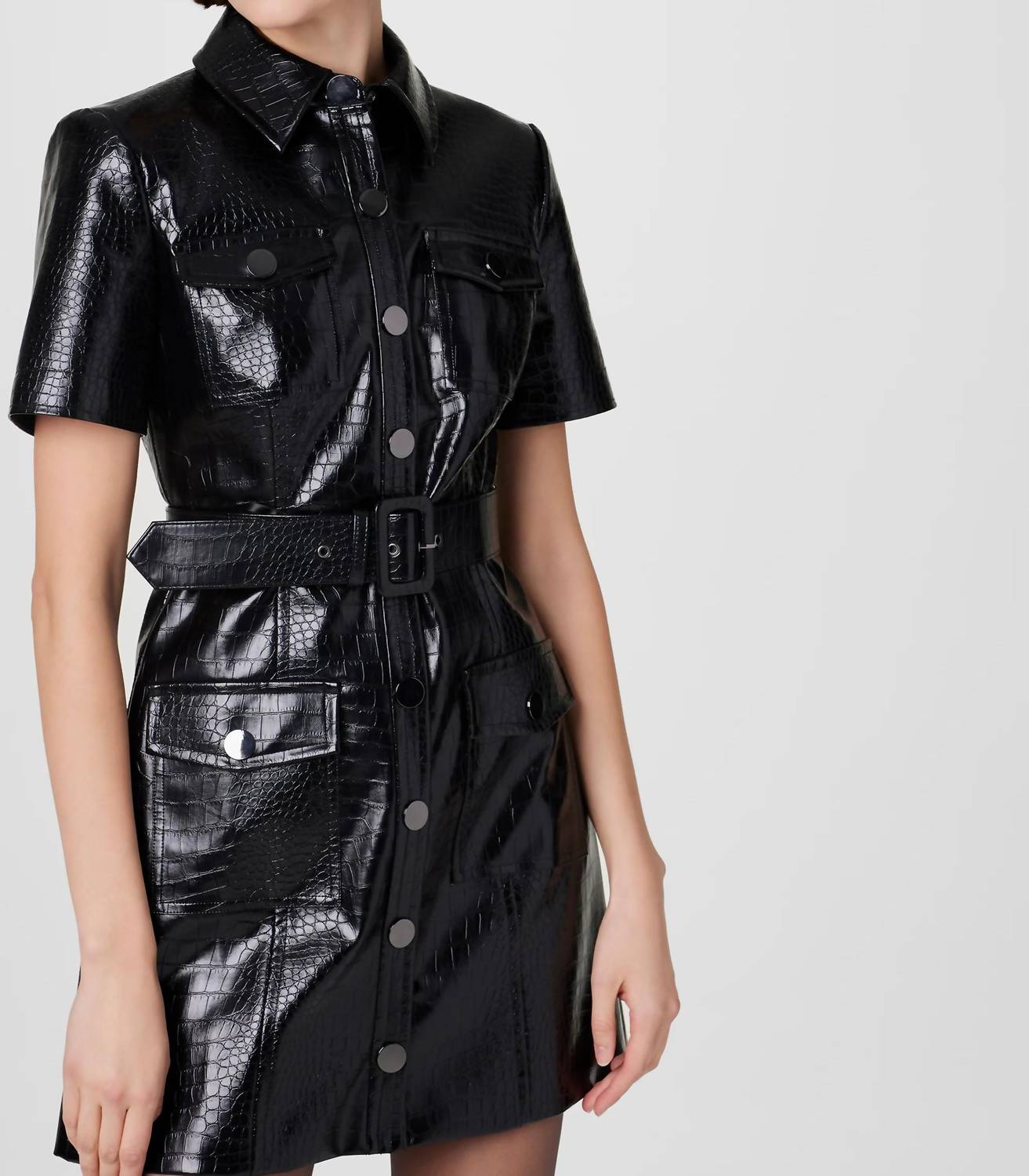 The perfect mini dress for those warmer months. Introducing the Lydia Vegan Leather Mini Dress by TOCCIN, a minimalist evening piece in classic black. This short-sleeve A-line dress is crafted from 100% vegan leather polyester with a polyester lining, featuring a 34" length from shoulder to hem. Adorned with a black textured pattern and complemented by brass snap closures, this dress includes patch pockets and a belt to cinch the waist. Care for this stylish piece with machine washing, then lay flat to dry or tumble dry low, and avoid bleaching.