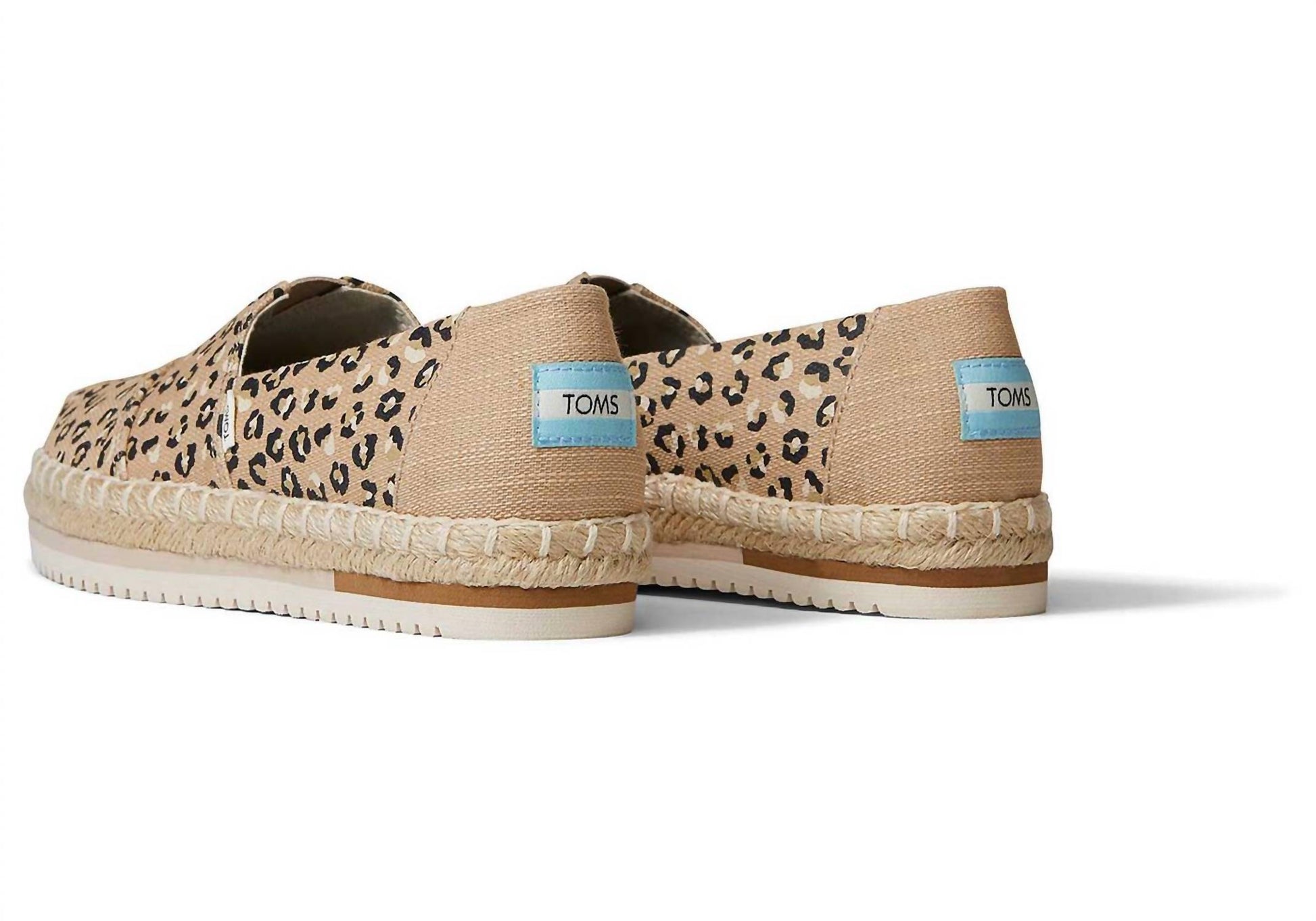 Nothing says vacation quite like a nice pair of espadrilles. Meet the Women's Alpargata Platform Rope Espadrilles by TOMS, a stylish blend of comfort and fashion. These espadrilles feature a natural textured cheetah finish on a canvas upper, boasting a chic espadrille platform with a round toe. Designed with a special rubber outsole and an elastic EVA sole detail, this shoe ensures comfort with a removable espadrille insole, and it's 100% vegan.