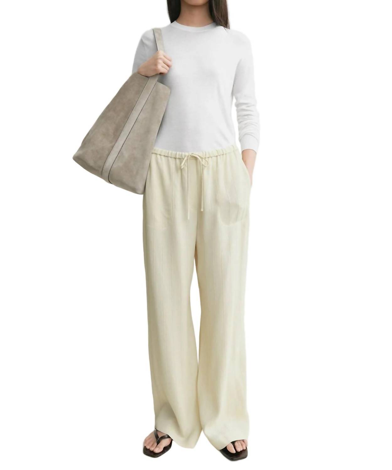 Presenting the Woven Drawstring Stripe Trousers by TOTEME, a perfect travel companion in elegant ecru. These trousers boast a relaxed fit and a stylish wide leg with a high-rise, elasticated drawstring waistband for ultimate comfort. Crafted from 96% viscose and 4% linen, they feature convenient side and back pockets. For easy care, simply machine wash following the tonal stripe design's minimalist charm.