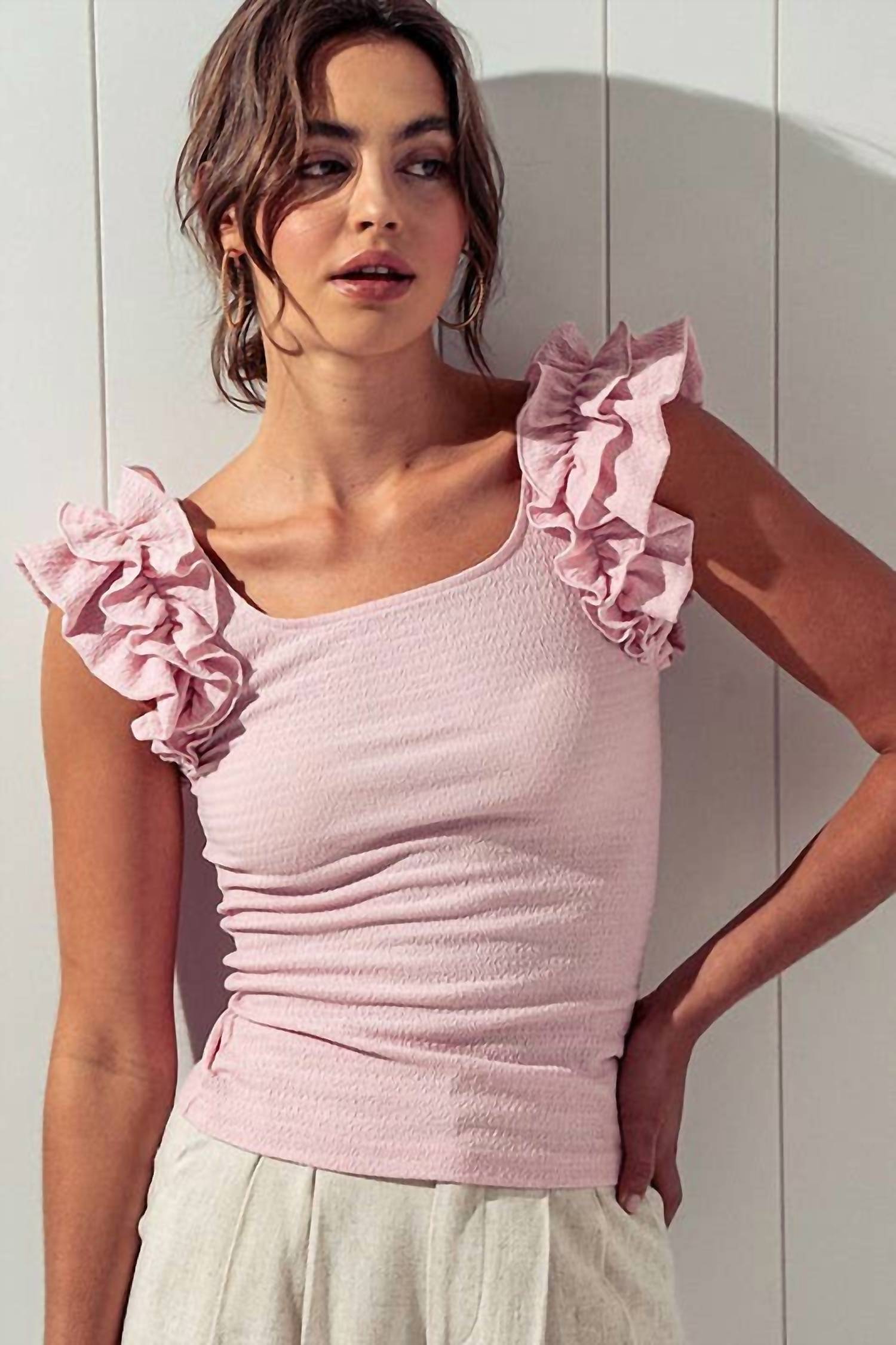 Pair this with your favorite jeans and slides for your next girls night out. Introducing the Ruffled Scrunchy Shoulder Top by trend:notes, an elegantly textured sleeveless blouse in a charming pink hue. This women's top features a stylish square neckline, perfect for adding a touch of sophistication to any outfit. Made with a convenient pull-on closure. A must-have piece for your wardrobe.