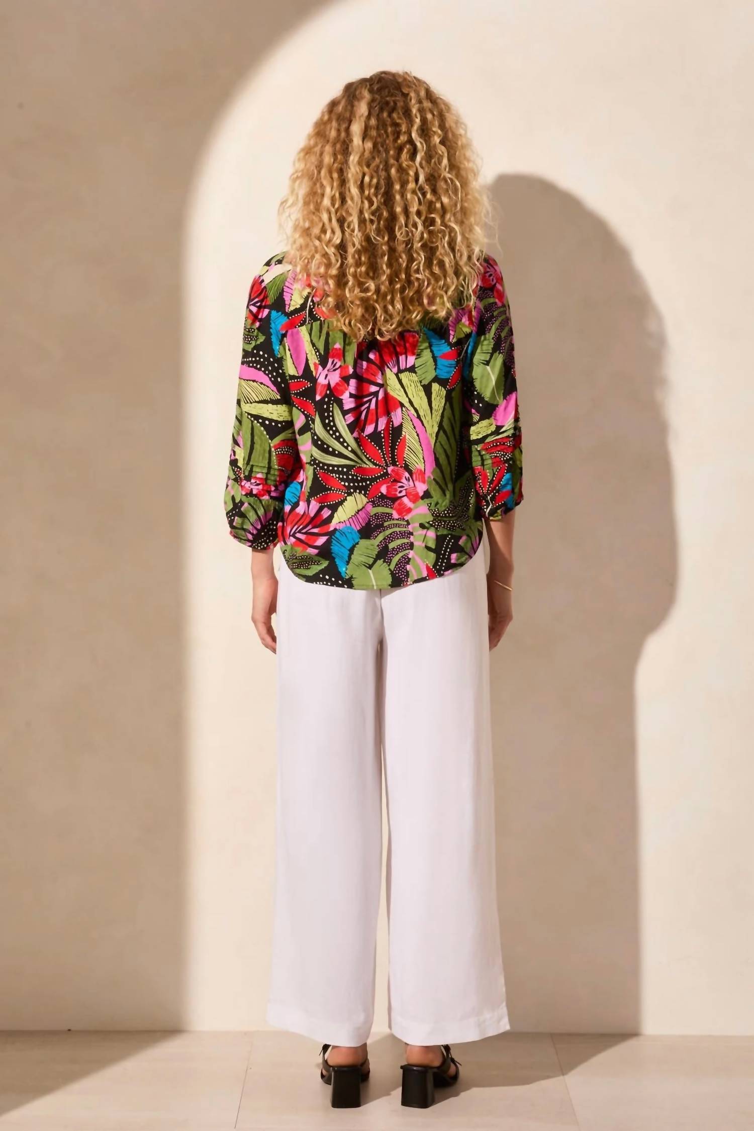 A versatile blouse that works from desk to dinner! Button-front with v-neckline 3/4 length sleeves Elastic at sleeve cuff Shell buttons Decorative pleating on front yoke and sleeves Printed textured challis fabric Care Machine wash normal cycle cold water, with like colors, do not bleach, d5, low iron if needed.