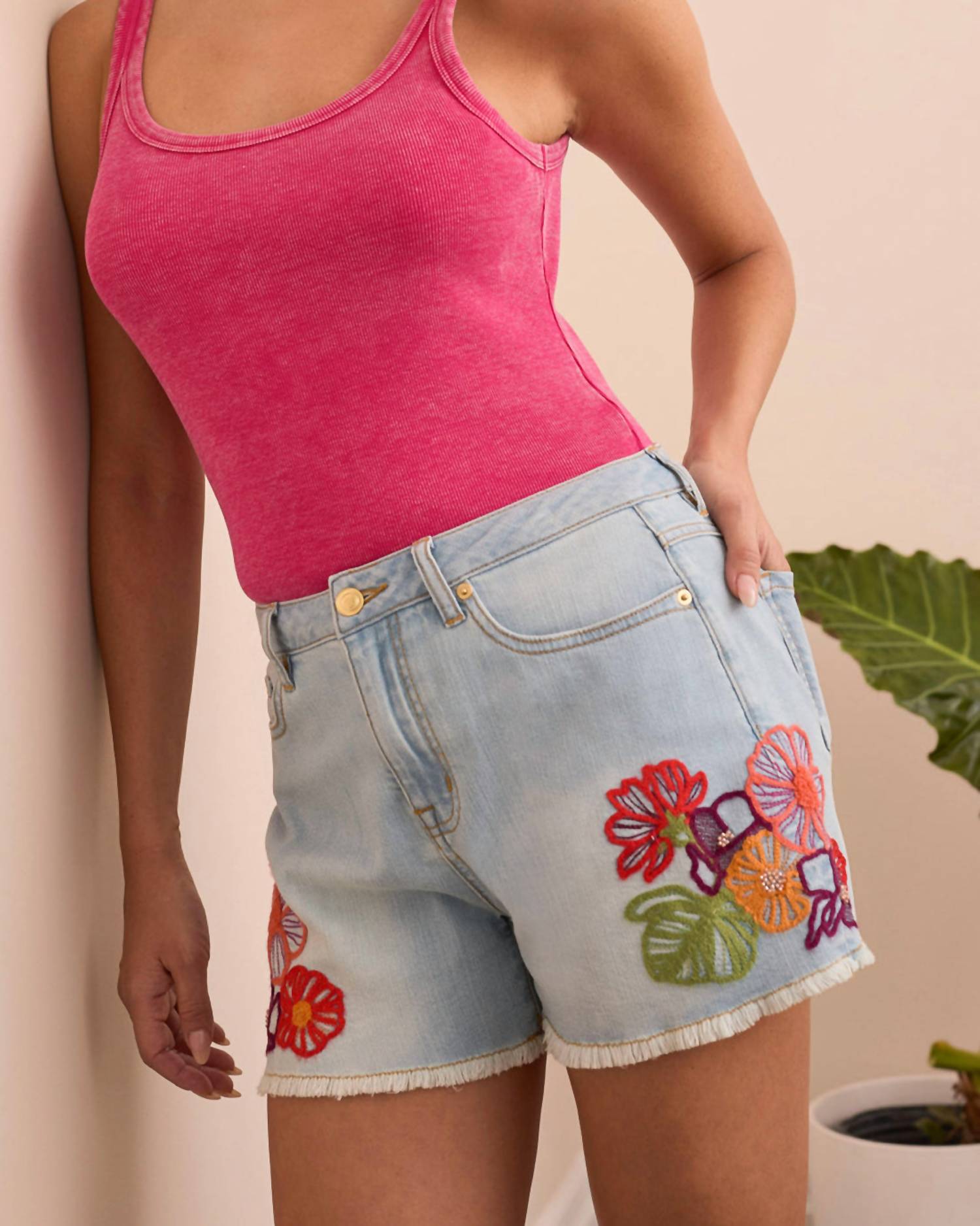 Not only cute but extremely comfortable. The jean shorts you will be reaching for all season long. Experience effortless summer style with the Audrey Embroidered Shorts by TRIBAL in a chic Blue Tropic hue. These midrise shorts are crafted from a soft cotton blend, offering a flattering light wash complemented by delicate floral embroidery. They feature a comfortable fit with practical pockets and a secure button closure, making them suitable for various occasions, from weekend outings to dinner parties. Composition: 58% Cotton, 41% Lyocell, 1% Lycra. Care: Machine wash and lay flat to dry.