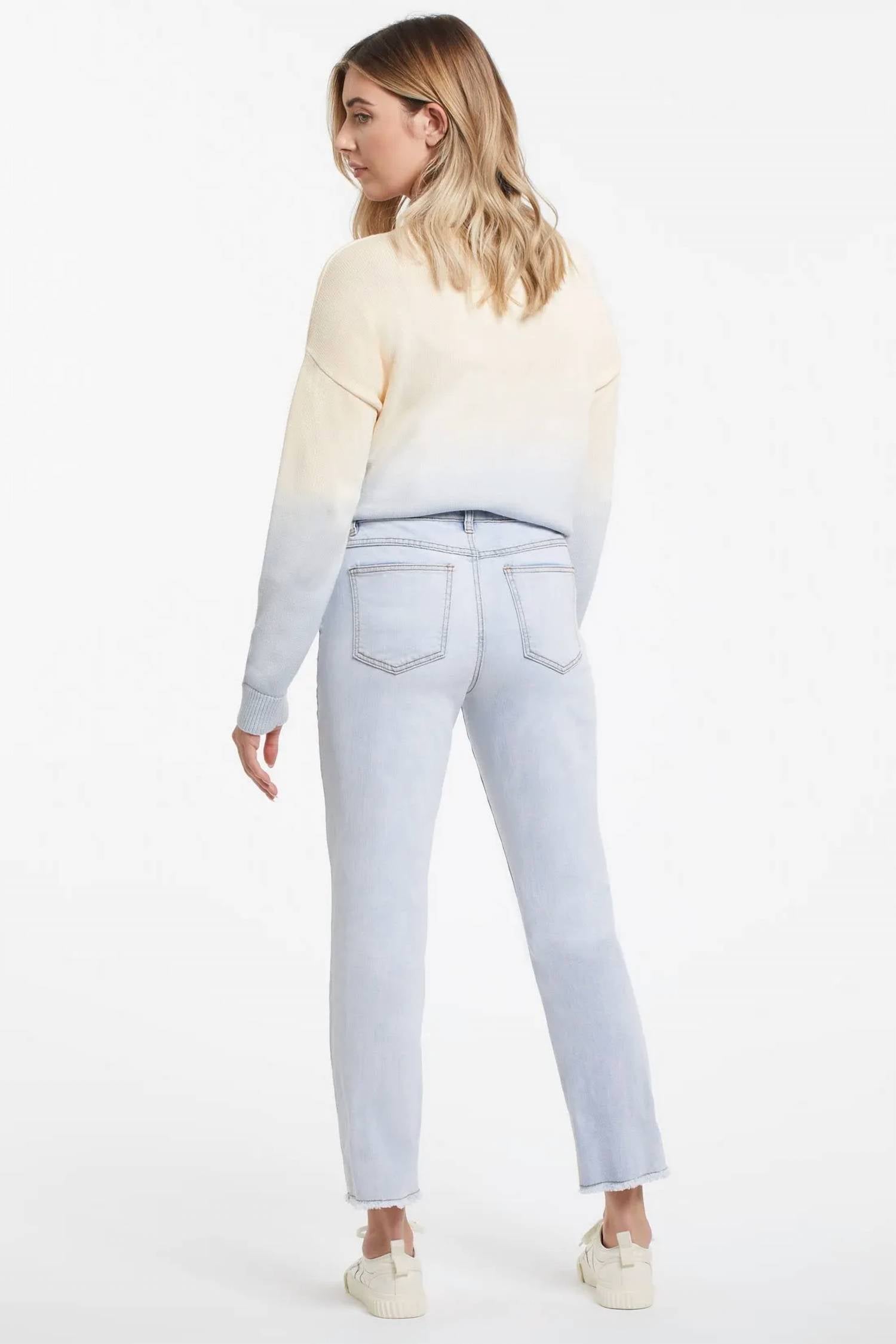 We especially love this cropped jean with a cute pair of slides or sandals. Front fly and button closure. Relaxed fit. Mid rise. 5 pockets. Stretch denim.