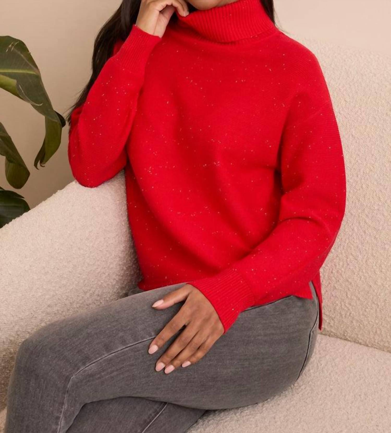 Layer under your favorite sweater or wear tucked into jeans for a perfectly polished winter look. Introducing the Jewel Red High-low Turtleneck Sweater by TRIBAL, the perfect choice for your holiday party ensemble this fall. This minimalist piece features long sleeves, a large turtleneck, and a flattering high-low hem with side slits that provide added comfort and breathability. Crafted from Rayon, it showcases subtle sequin details for a touch of shimmer, and is designed with ribbed accents on the neckline, sleeves, and hem. This women's sweater is easy to style with a pull-on closure and requires hand washing in cold water, separately, with flat drying inside out. Style number: 5980O-5063-1506.