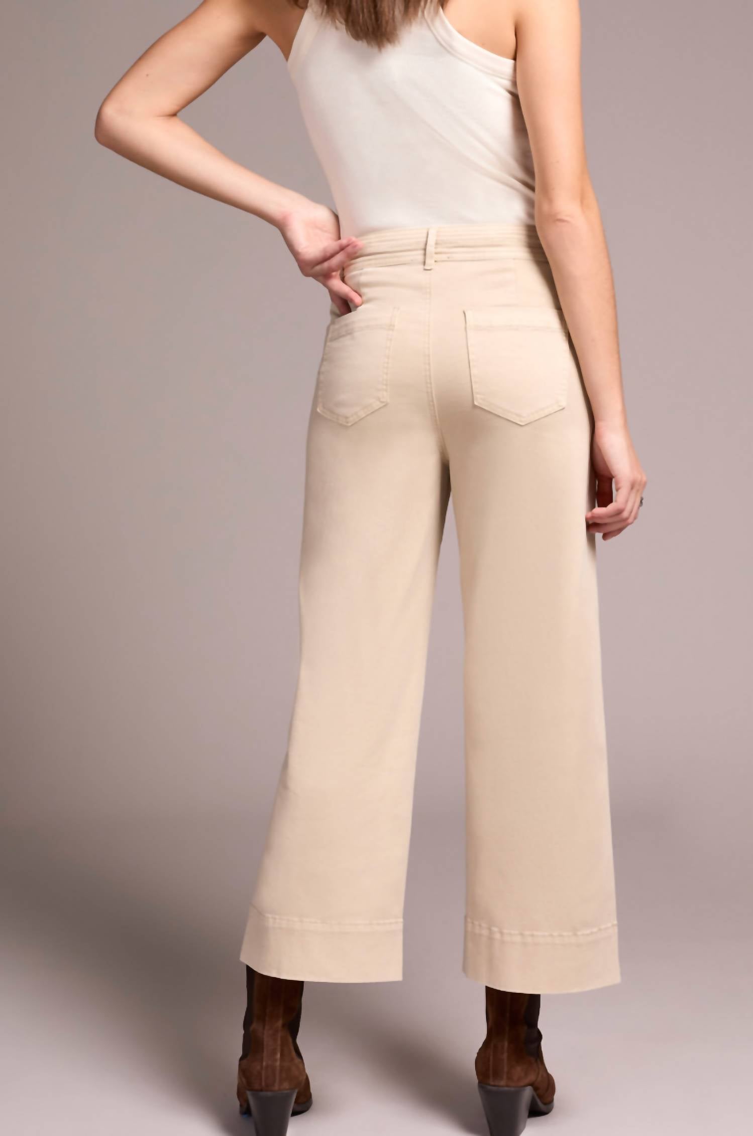 The perfect casually cool capri pant. These palazzo jeans feature a high-rise waist, wide cropped legs, and a 26" inseam for a flattering silhouette. They have a double-button closure, classic fly, decorative waistband topstitching, functional front slit pockets, and back patch pockets. Made from soft stretch twill fabric with 85% cotton, 12% polyester, and 3% spandex. Machine washable. Made in China.