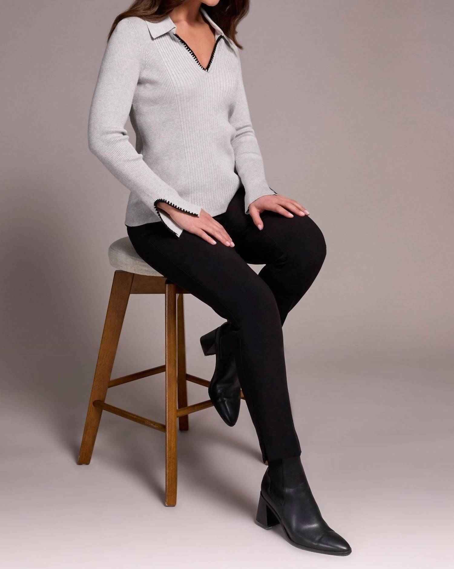 You'll be reaching for this comfy and classic v-neck sweater all season long. Introducing the Long Sleeve Polo Sweater by TRIBAL, a sophisticated piece in a Grey Mix color perfect for the minimalist trend. This women's sweater features long sleeves and a Johnny collar v-neckline, complemented by contrast stitching for an artisanal touch. Crafted from 72% spun rayon and 28% nylon, it offers a luxurious feel and a tailored fit to flatter your figure. Closure: Pull on. Care: Hand wash separately in cold water, do not bleach, lay flat to dry, and low iron if needed.