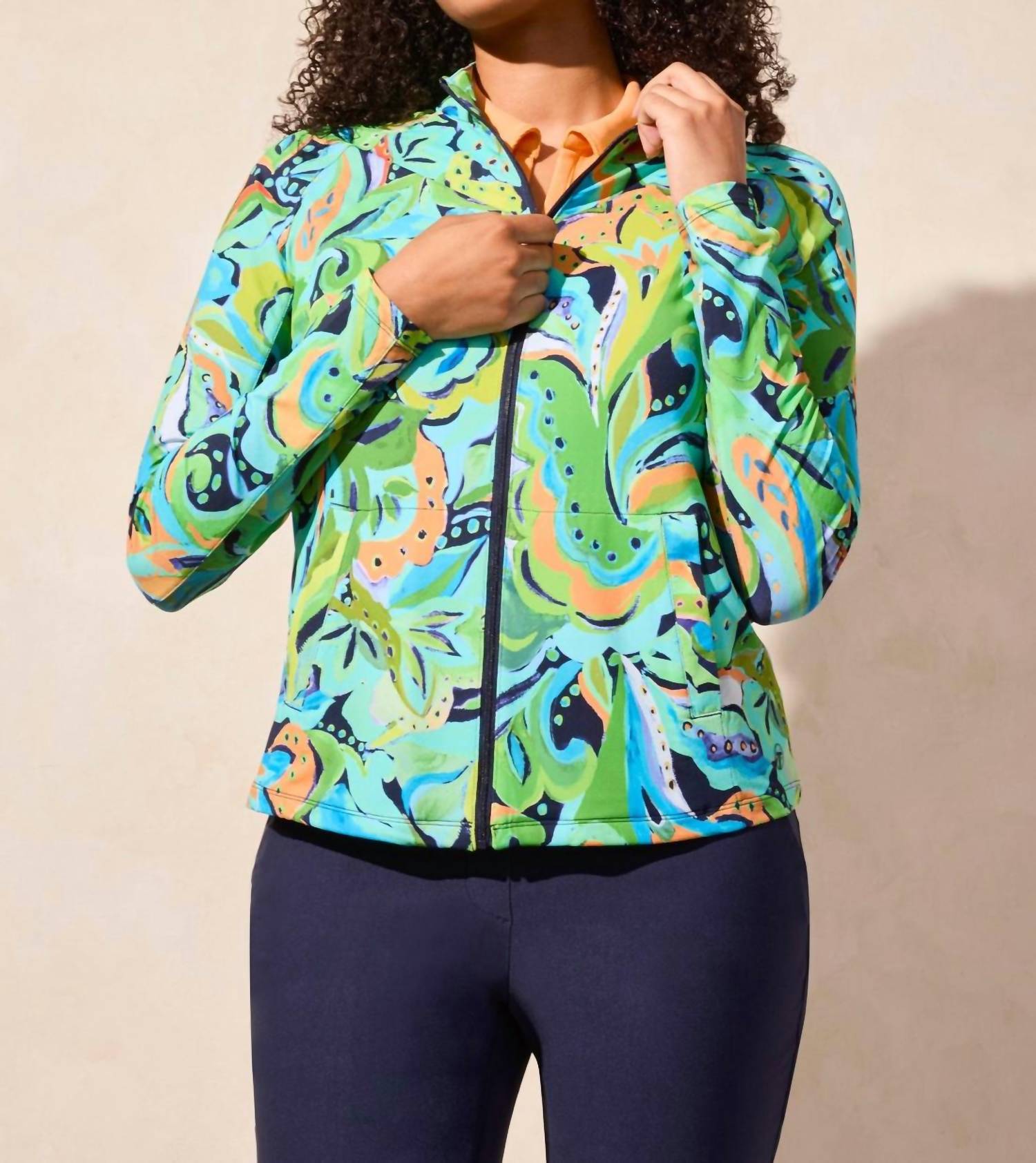 A jacket so versatile you can literally wear it with anything. Introducing the Printed Mock-neck Jacket by TRIBAL, a stylish choice in Jungle designed for the modern woman. This long sleeve casual jacket boasts a nylon blend composition featuring 84% nylon and 16% spandex for stretch and comfort. The zip closure enhances convenience, while the mock neck adds a touch of sophistication. Enhanced with moisture-wicking, quick-dry, anti-bacterial properties, and UPF 50+ protection, this piece features bold floral-inspired prints, front pockets, and a printed textured knit. Care: Machine wash.