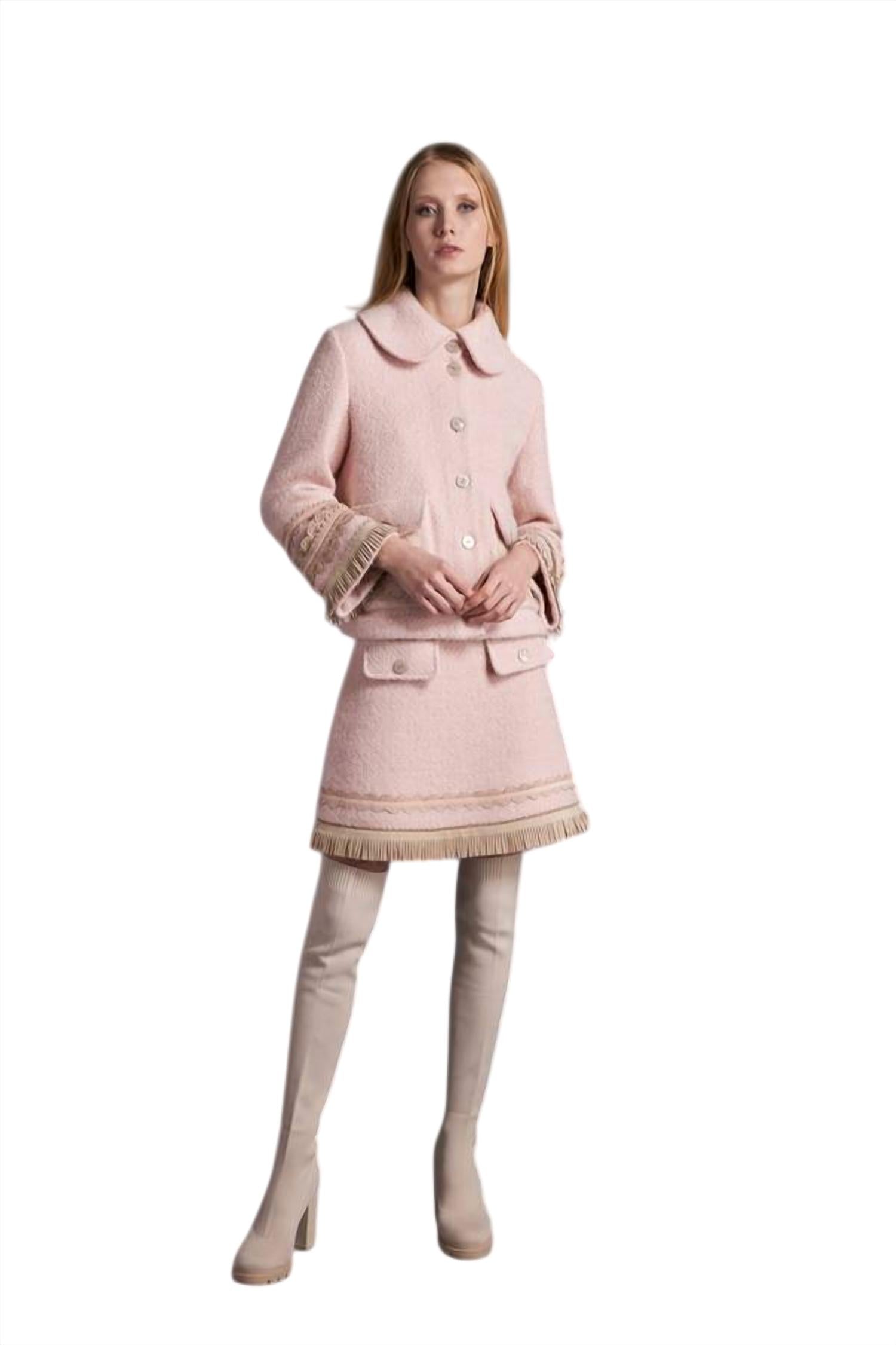 Show just the right amount of leg in this fit flattering mini. Basket weave mini skirt with faux leather fringe at the bottom.