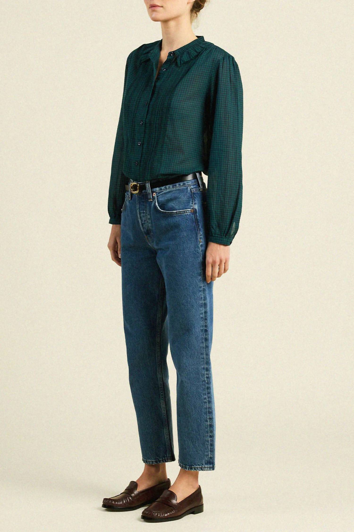 Pair this with your favorite jeans and slides for your next girls night out. Embrace a vintage-inspired look with the Alise Blouse by TROVATA, tailored for the perfect touch of elegance. This charming piece, designed in sea pine check print, features long sleeves with button cuffs, a ruffled collar, and intricate pintuck details. Made from 100% lightweight cotton, it offers a button front closure for effortless wearing. Measuring 24 inches in length for a size small, it is easy to care for with machine washing.