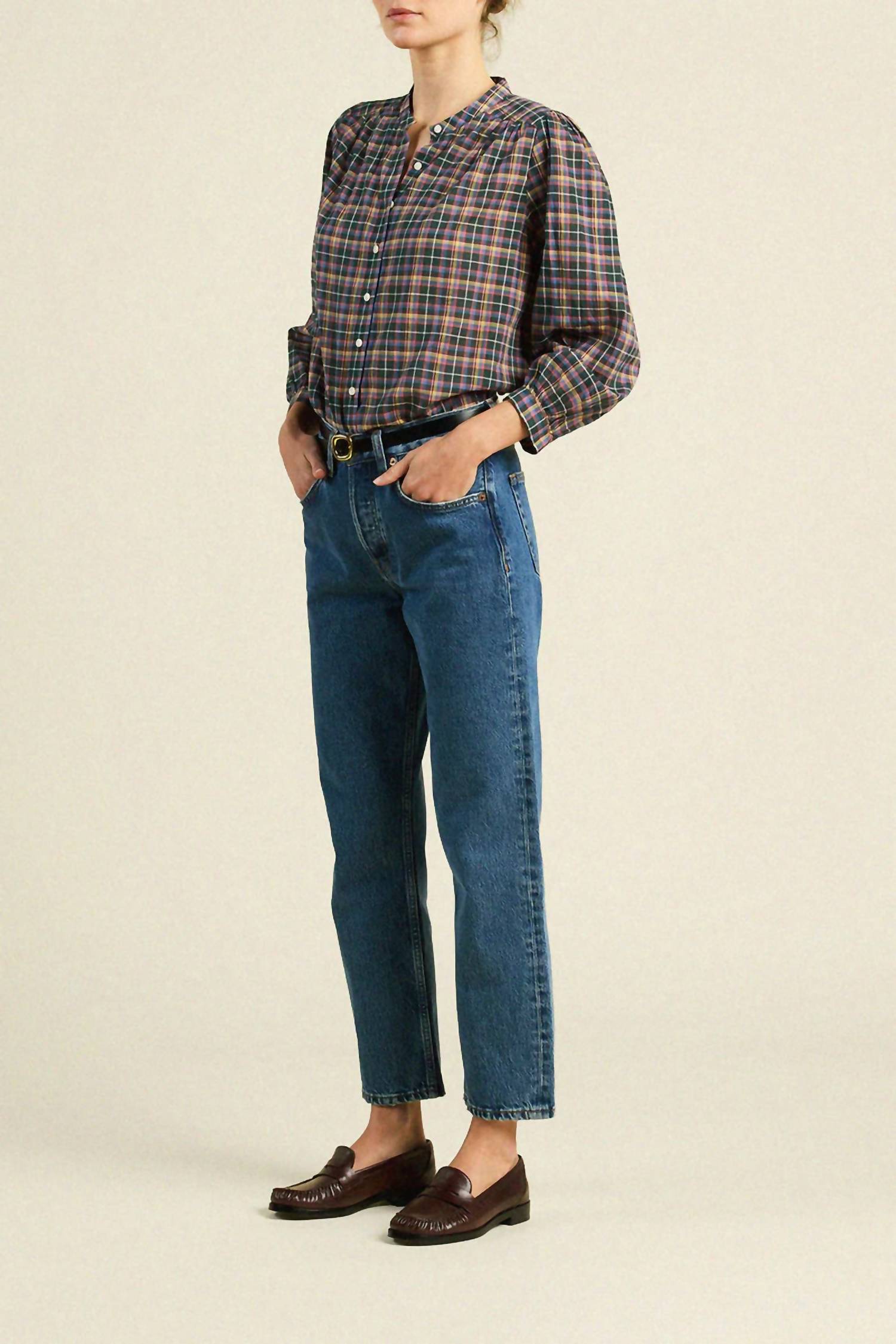 Pair this with your favorite jeans and slides for your next girls night out. Introducing the Clara Button-front Blouse by TROVATA, a stylish addition to any wardrobe with its elegant Prisma Plaid design. Featuring three-quarter sleeves and a sleek standing collar, this blouse is crafted from ultra-soft 100% cotton, ensuring everyday ease and comfort. Closure is a classic button front, and the blouse is designed in California. Care for it with a machine wash cold, tumble dry low, and medium iron as needed.