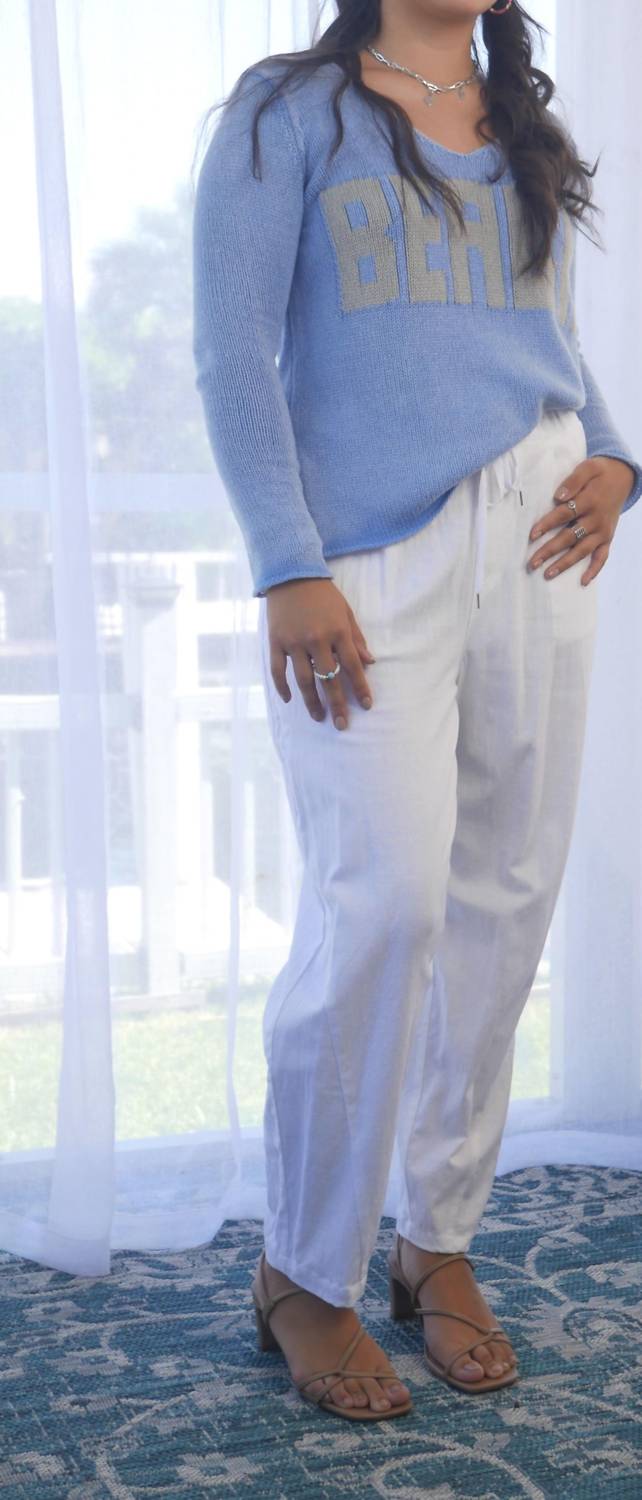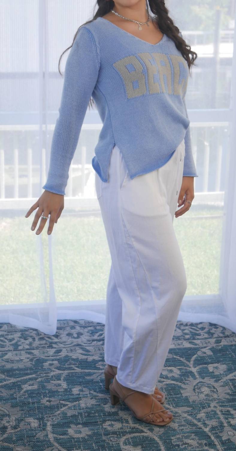 Wear this v-neck sweater with your favorite denim for the perfect fall look. Introducing the Beach Lovers Sweater by Trove, a must-have for minimalist summer wardrobes in a refreshing blue hue. Crafted from 100% cotton, this V-neck sweater features long sleeves and a graphic pattern, perfect for beach-loving trendsetters. Country of origin information is not provided. Care instructions are not specified, allowing you to choose your own preferred method of keeping this stylish piece fresh.