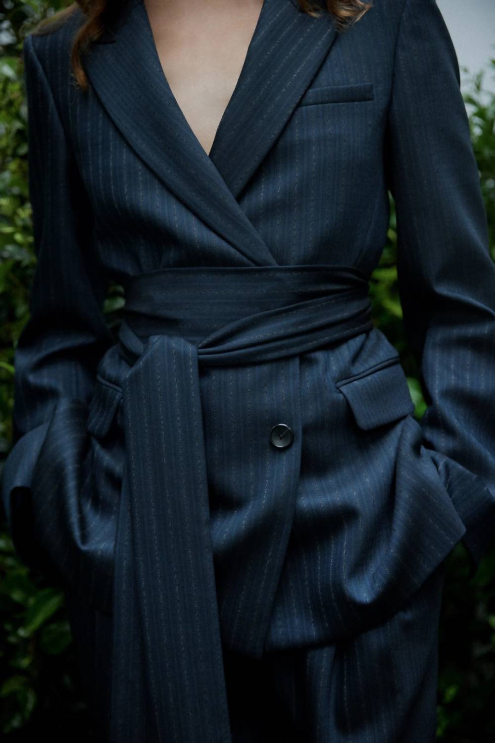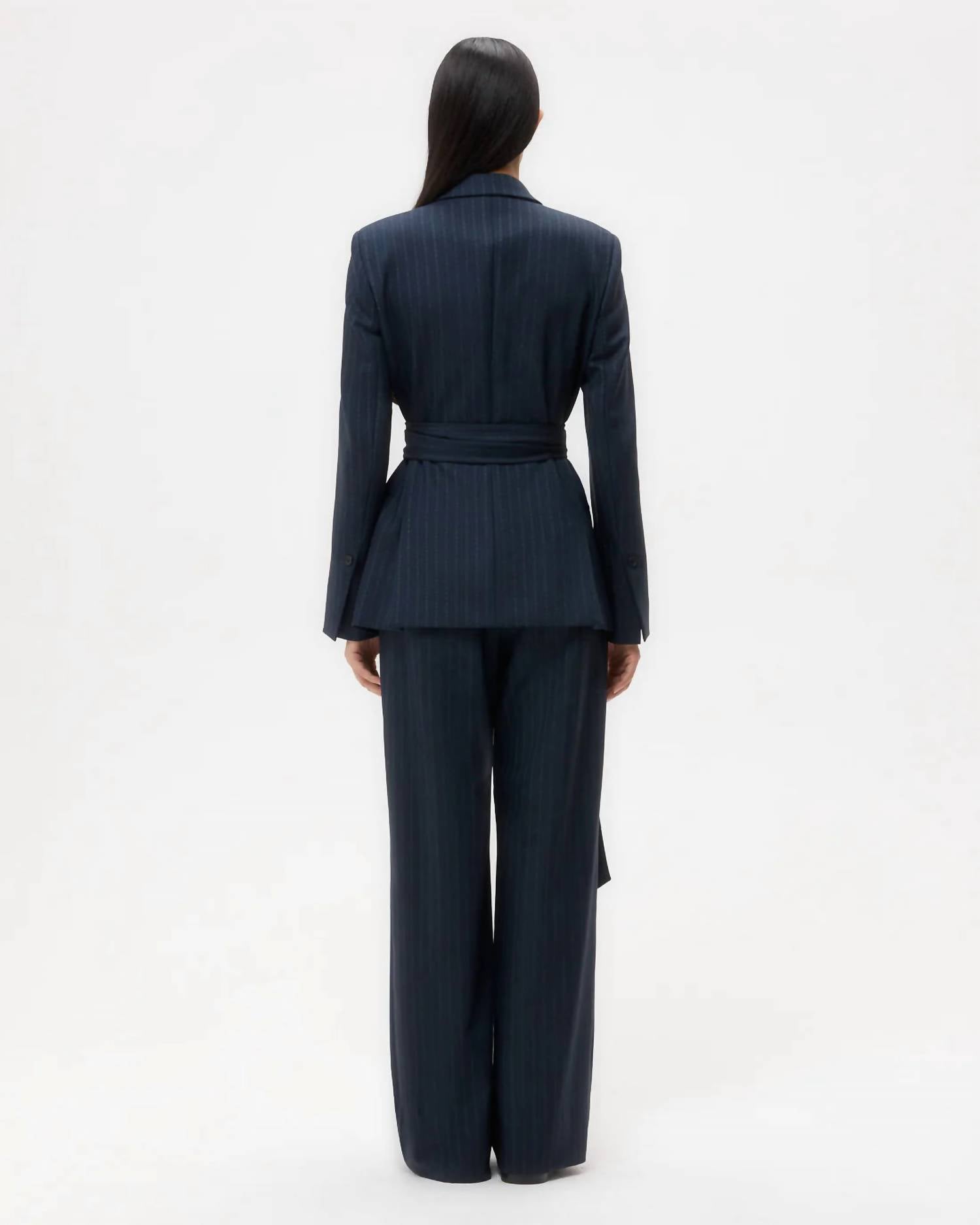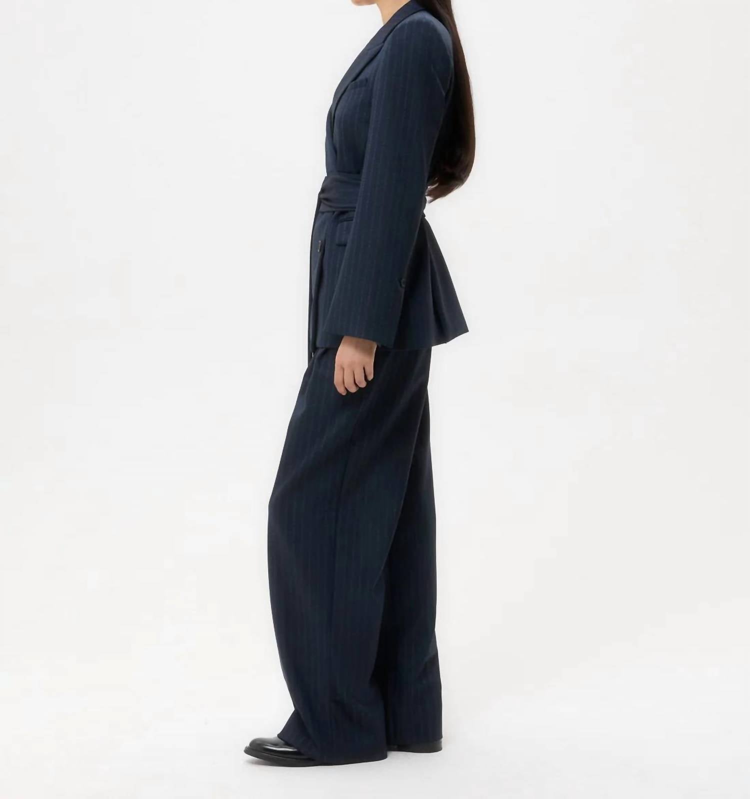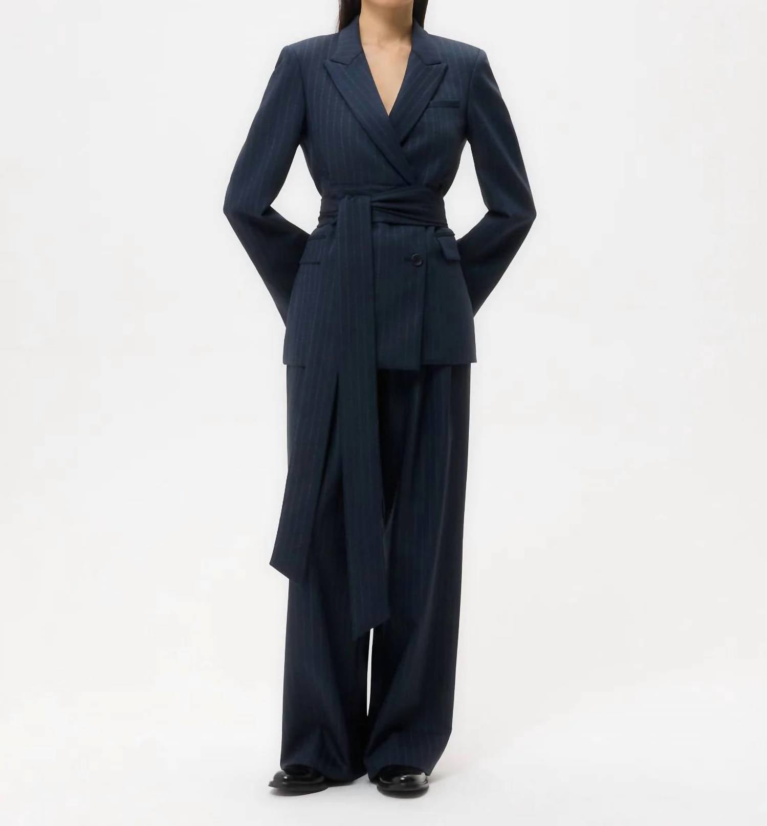 An elevated version of your favorite classic blazer. Introducing the Delancey Insignia Jacket by TWP, a striking blazer designed for a black-tie event. This long-sleeve blazer in a sophisticated blue stripe features a viscose-wool blend with a hint of stretch, providing both comfort and style. Enhanced with strong shoulders and a relaxed, boxy silhouette, it is completed with peak lapels, a chest welt pocket, flap side pockets, and a self-tie belt to cinch the waist. Composition: 98% Wool, 2% Elastane.